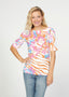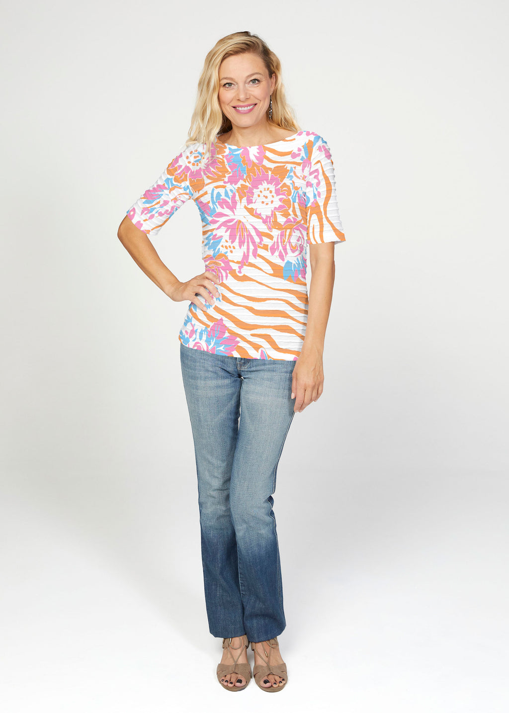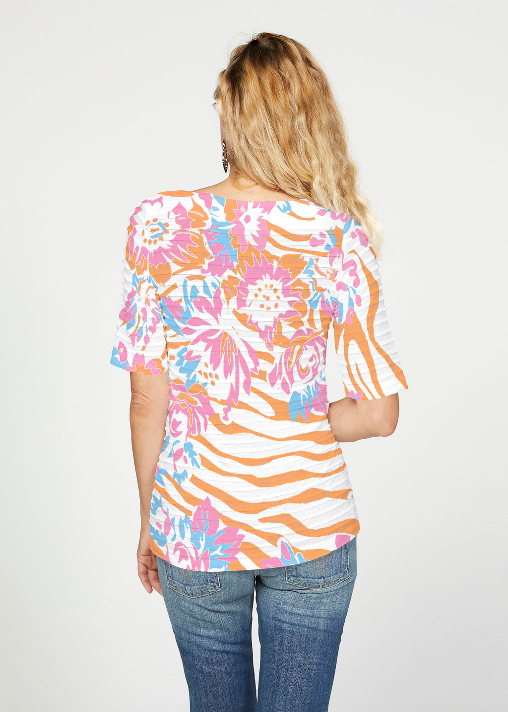 The uniquely soft, pleated texture in this Banded fabric gives the elbow sleeve and boat neck top a fun and sophisticated look. Easy relaxed fit with a hemline that comes below the hip.