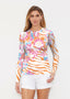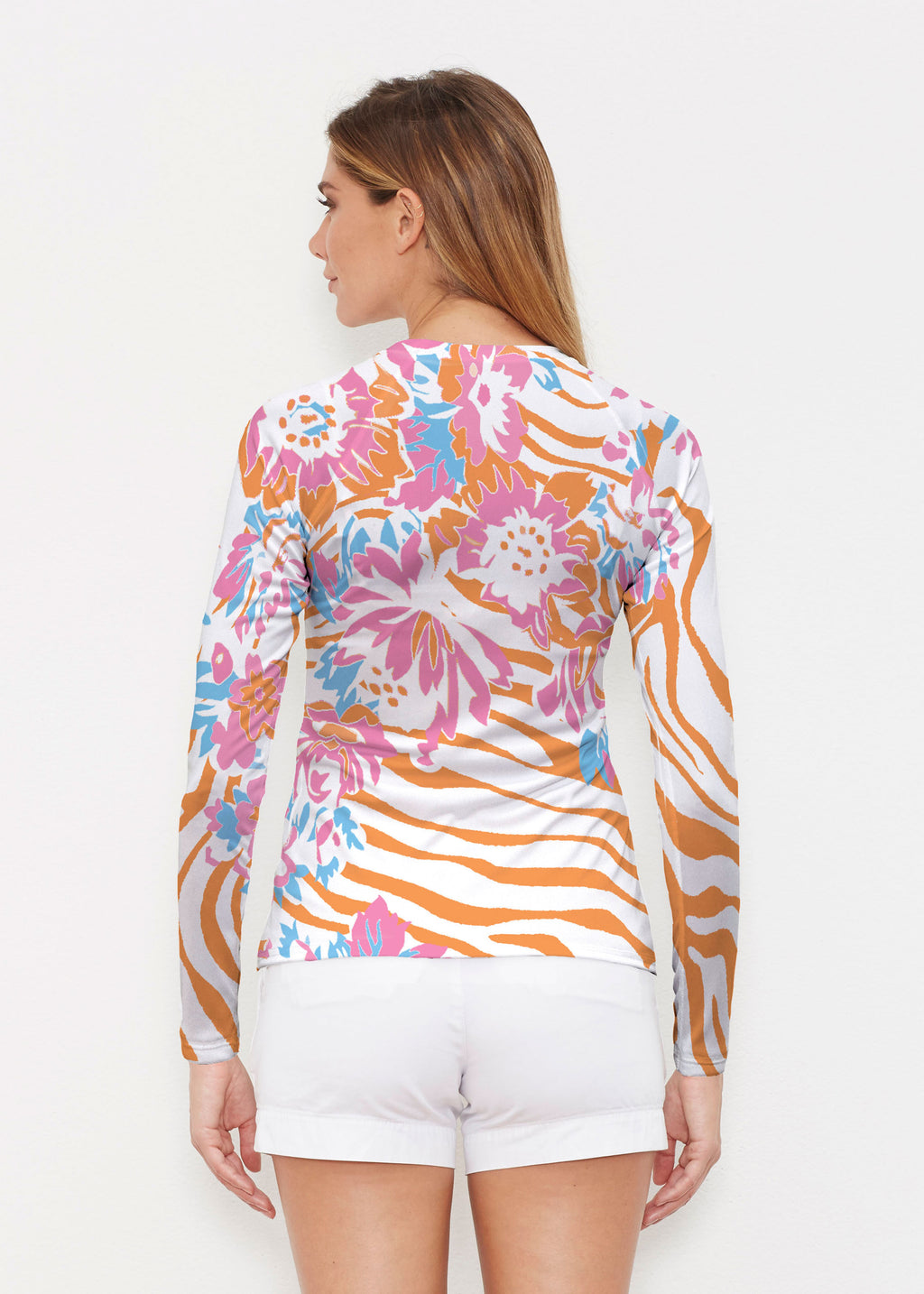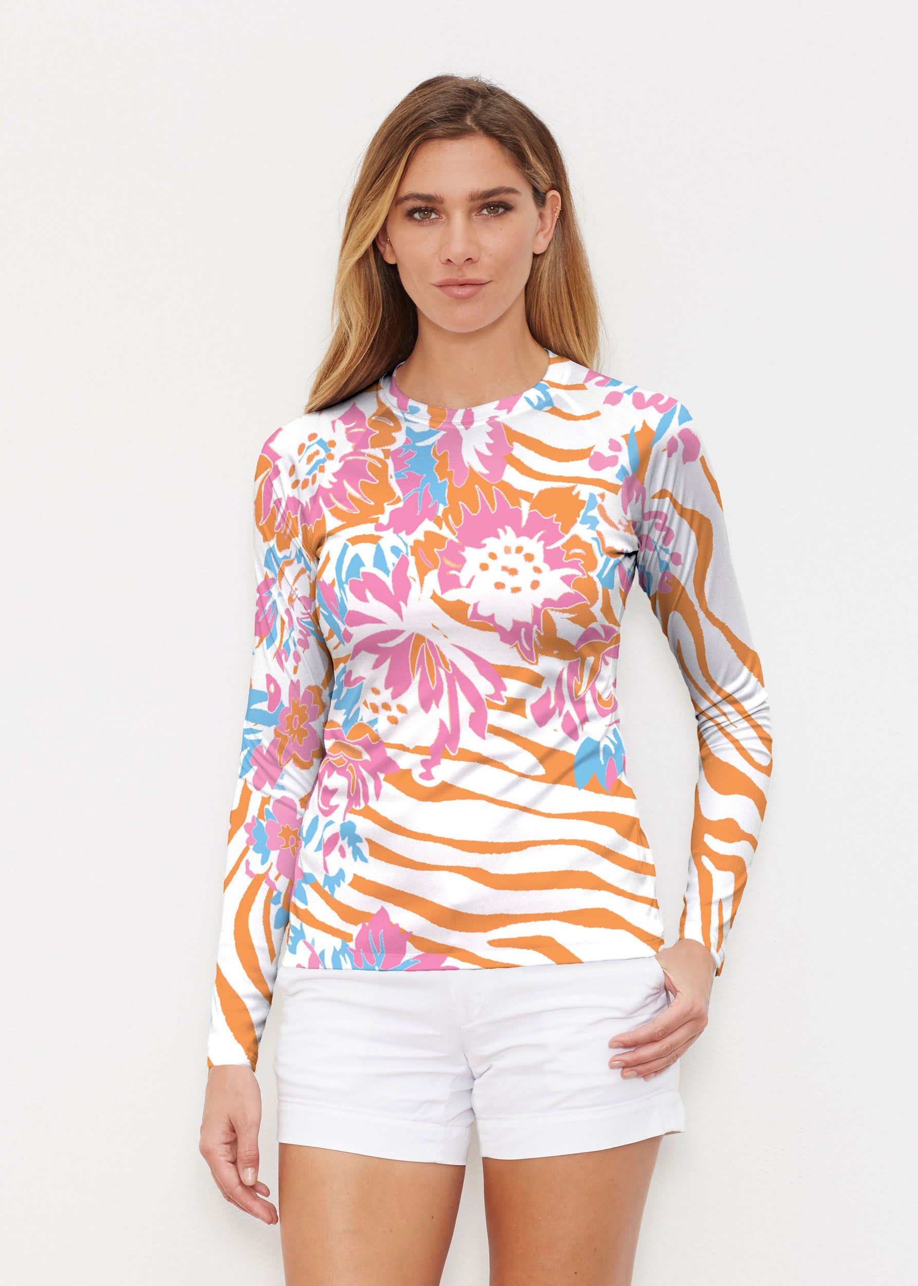 Our WHIMSY ROSE™ Safe Sun UPF 50+ long sleeve, crew neck rash guard offers versatile, beach-to-bistro style, supreme comfort, and an activewear fit. Made in a specially designed Safe Sun textile that blocks more harmful rays and provides a smart solution for those who love to swim, surf, kayak, canoe, waterski, boat, or simply relax waterside.