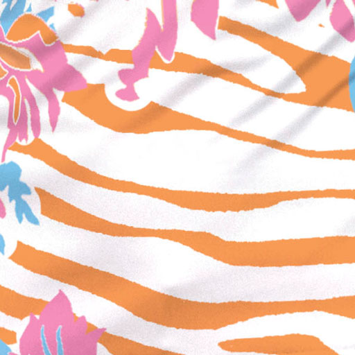 A playful orange and white zebra print with scattered pops of flowers in pink, orange & light blue.