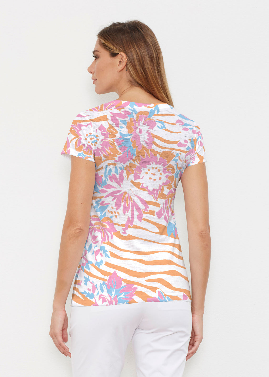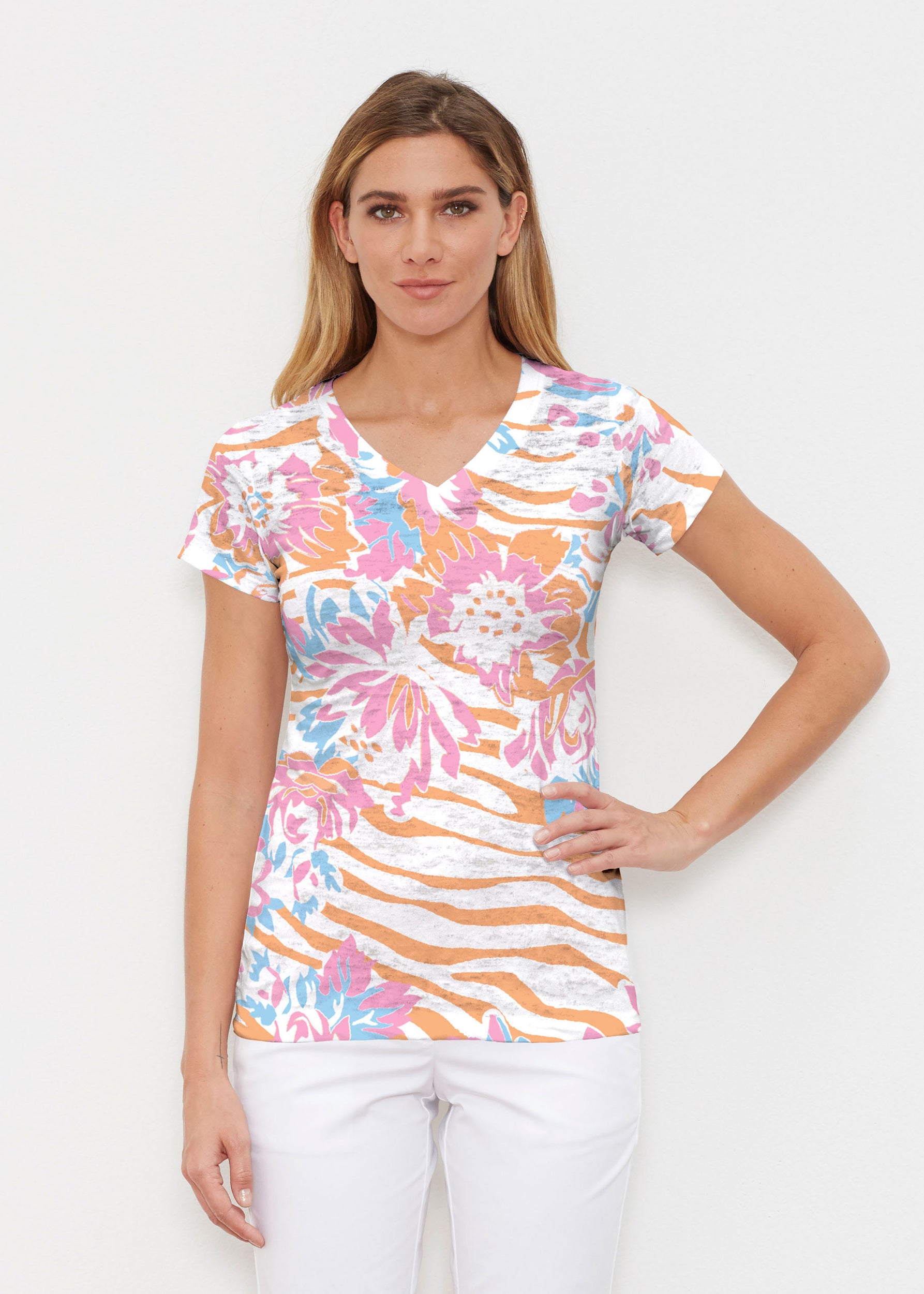 A playful orange and white zebra print with scattered pops of flowers in pink, orange & light blue.