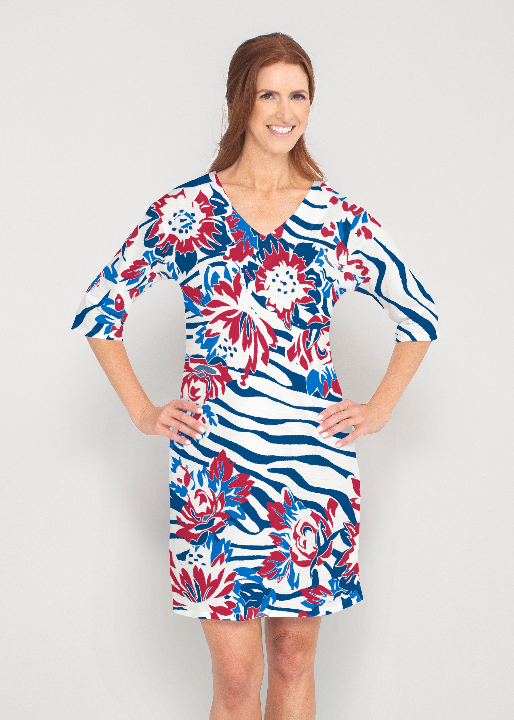 Zebra Posy Red-Blue (8132) ~ Lucy 3/4 Sleeve V-Neck Dress