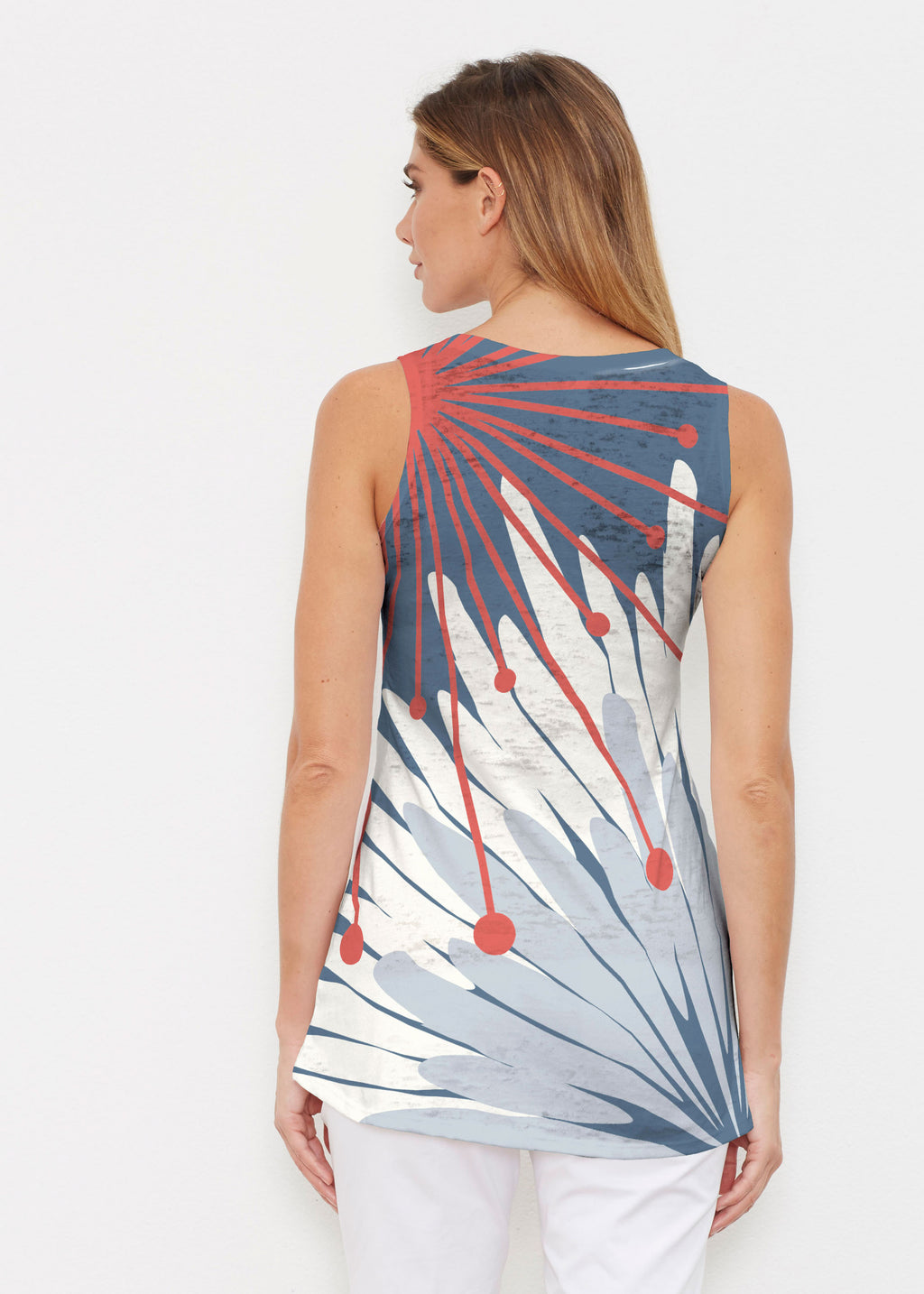 This tank is the perfect combination of an elegant shape with a sporty look. A high-low cascading hemline falls loosely over the hip in our Signature burnout fabric. No sleeves and a shallow scoop neckline give this tank its sporty vibe. -- Your one-of-a-kind garment is created using all-over soft garment sublimation printing. Selected designs are individually printed into your garment. Cotton/Polyester blend.
