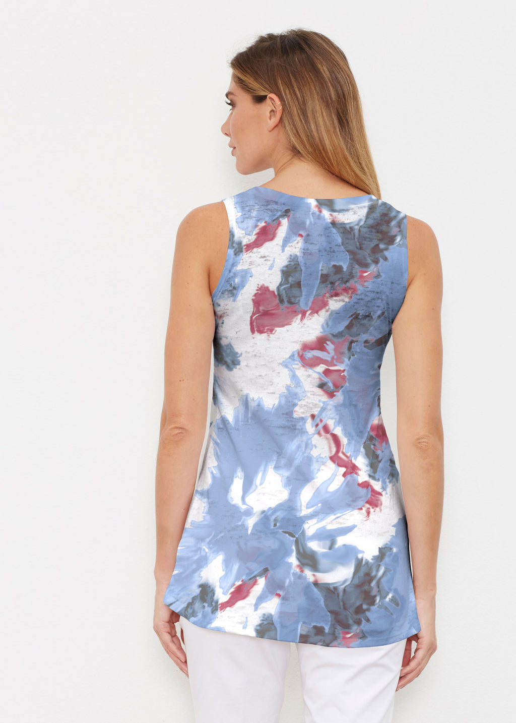 This tank is the perfect combination of an elegant shape with a sporty look. A high-low cascading hemline falls loosely over the hip in our Signature burnout fabric. No sleeves and a shallow scoop neckline give this tank its sporty vibe. -- Your one-of-a-kind garment is created using all-over soft garment sublimation printing. Selected designs are individually printed into your garment. Cotton/Polyester blend.