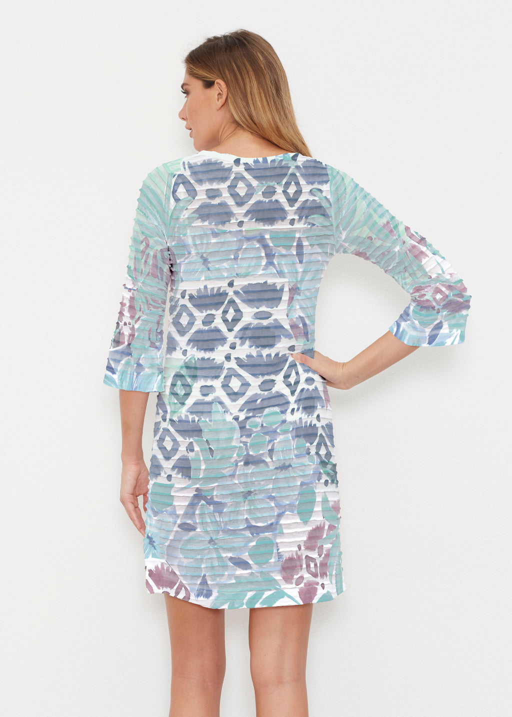 A sweetheart v-neckline and the soft, pleated texture of our Banded fabric make this piece unique. A forgiving fit, side vents, and 3/4 bell sleeves combine for a flattering look. The hemline falls above knee - just a bit shorter than our Classic dresses. --Your one-of-a-kind garment is created using all-over soft garment sublimation printing. Selected designs are individually printed into your garment. Polyester/Rayon blend.