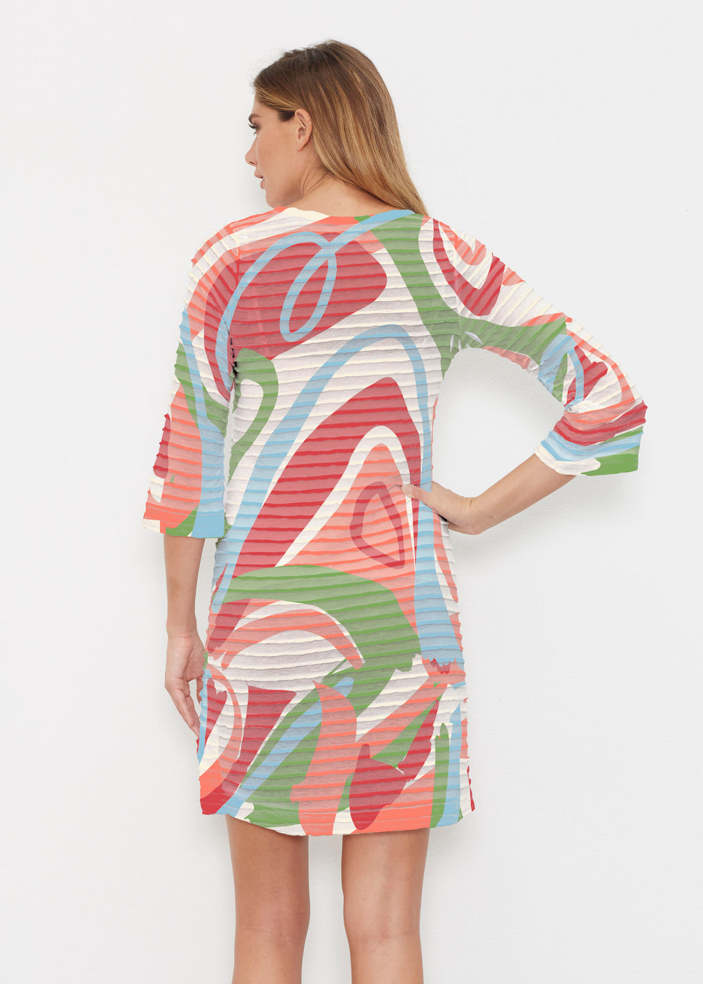 A sweetheart v-neckline and the soft, pleated texture of our Banded fabric make this piece unique. A forgiving fit, side vents, and 3/4 bell sleeves combine for a flattering look. The hemline falls above knee - just a bit shorter than our Classic dresses. --Your one-of-a-kind garment is created using all-over soft garment sublimation printing. Selected designs are individually printed into your garment. Polyester/Rayon blend.
