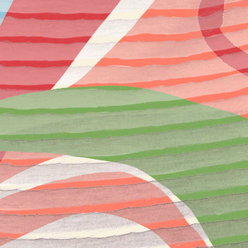 A whimsical print of fluid lines and geometric shapes in mossy green, steel blue, cranberry and peach on a creamy canvas.