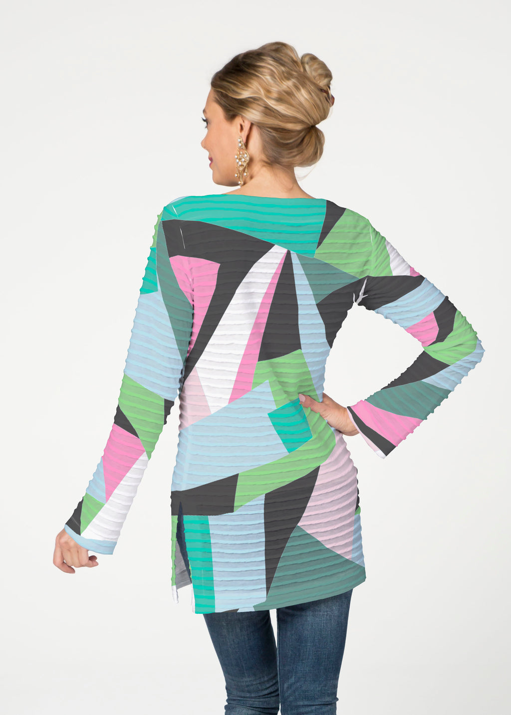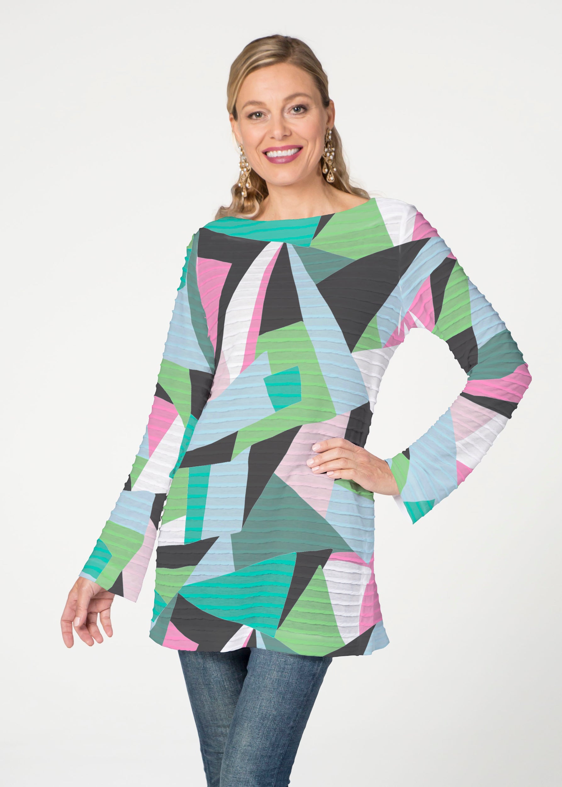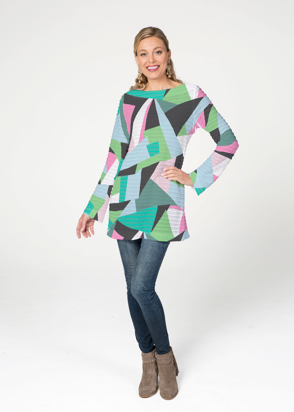 The Banded Boatneck Tunic has the soft pleated texture of our Banded fabric, making this a sophisticated, casual year round piece. A forgiving fit, side vents, with a relaxed full length sleeve combine for a flattering look. The hemline flows gently over the hip.