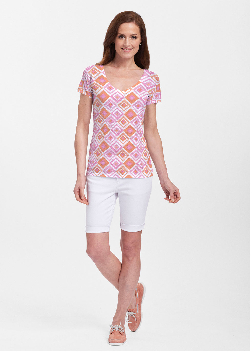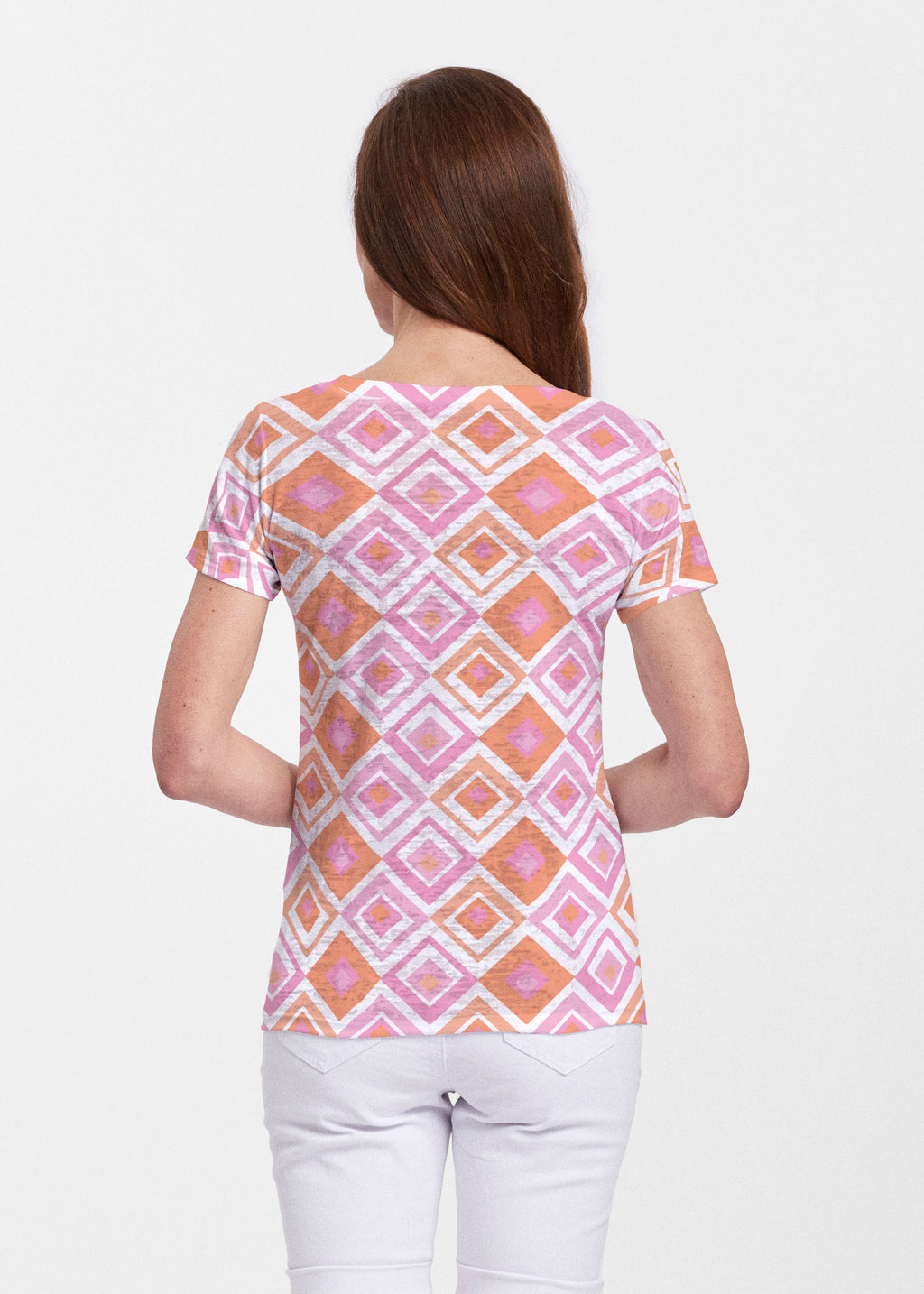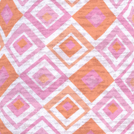 A simple yet sophisticated geometric print with playful diamond shapes of pink and orange designed by Susan Werner.