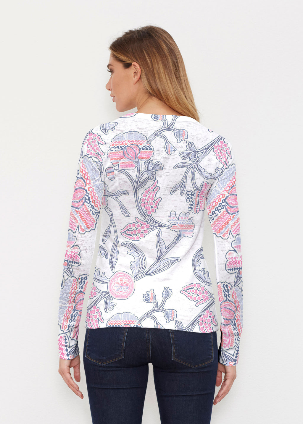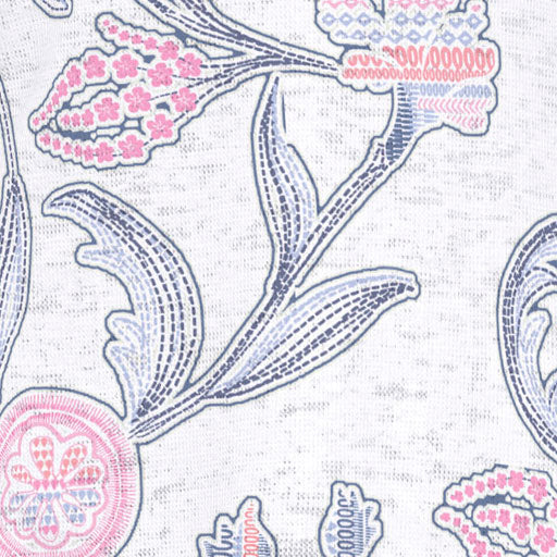 A playful print of stitched floral patterns on a white background and bold mixed sleeves. Designed by Susan Werner.
