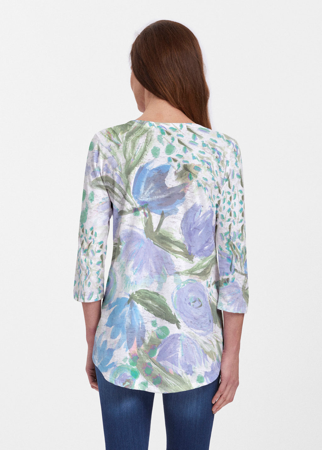 This v-neck tunic in our Signature burnout fabric is forever flattering. 3/4 sleeves and a v-neck flow into a full, swinging shirttail hem.
