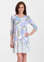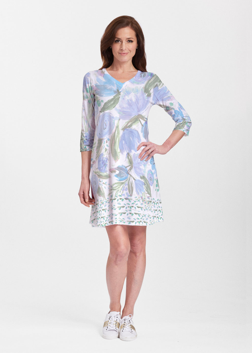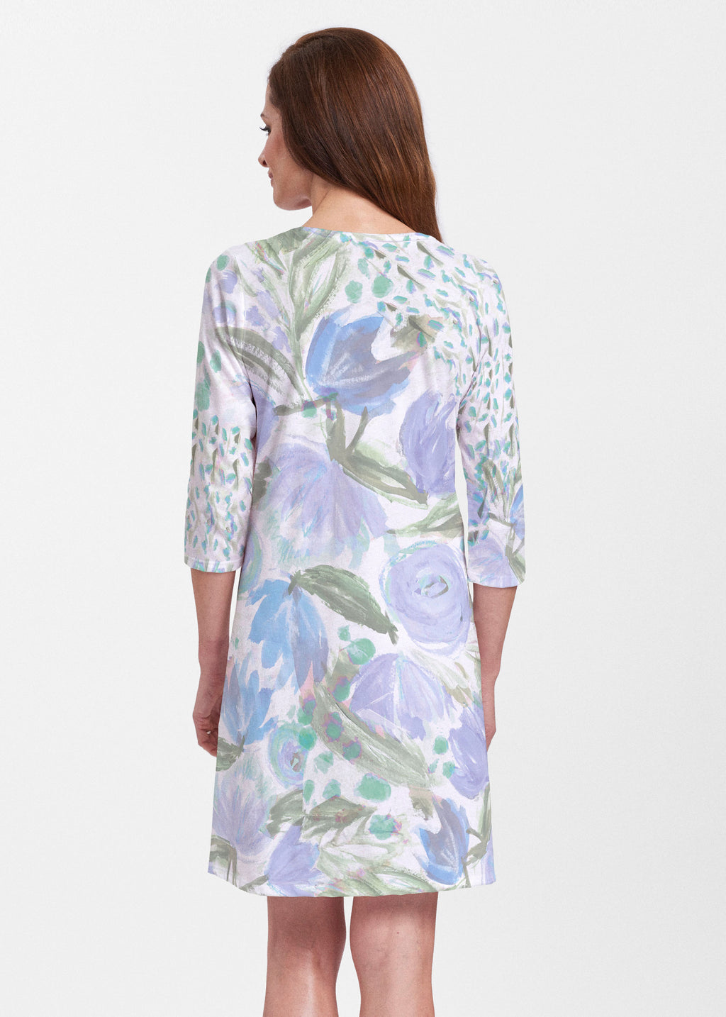 A relaxed swing silhouette with 3/4 sleeves and v-neck make up the newest edition to our Classic dress collection. Hem falls just above the knee.