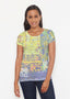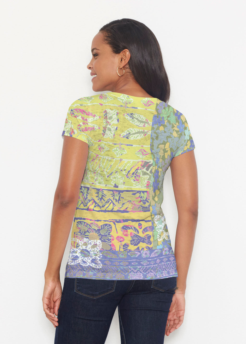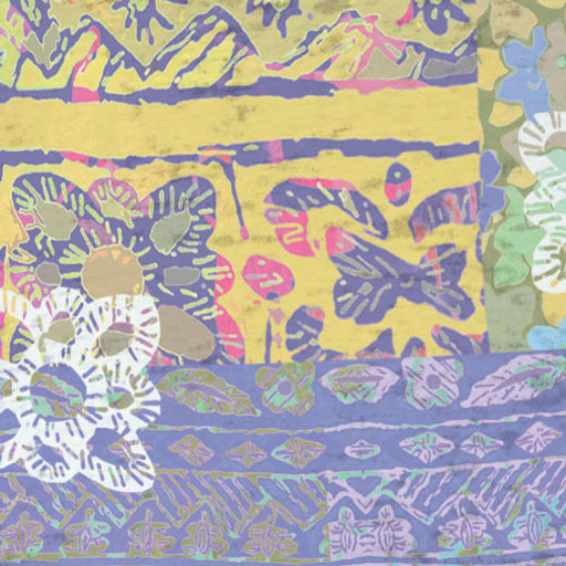 A playful collage of floral geometric yellows, purples, greys and pops of lime green.