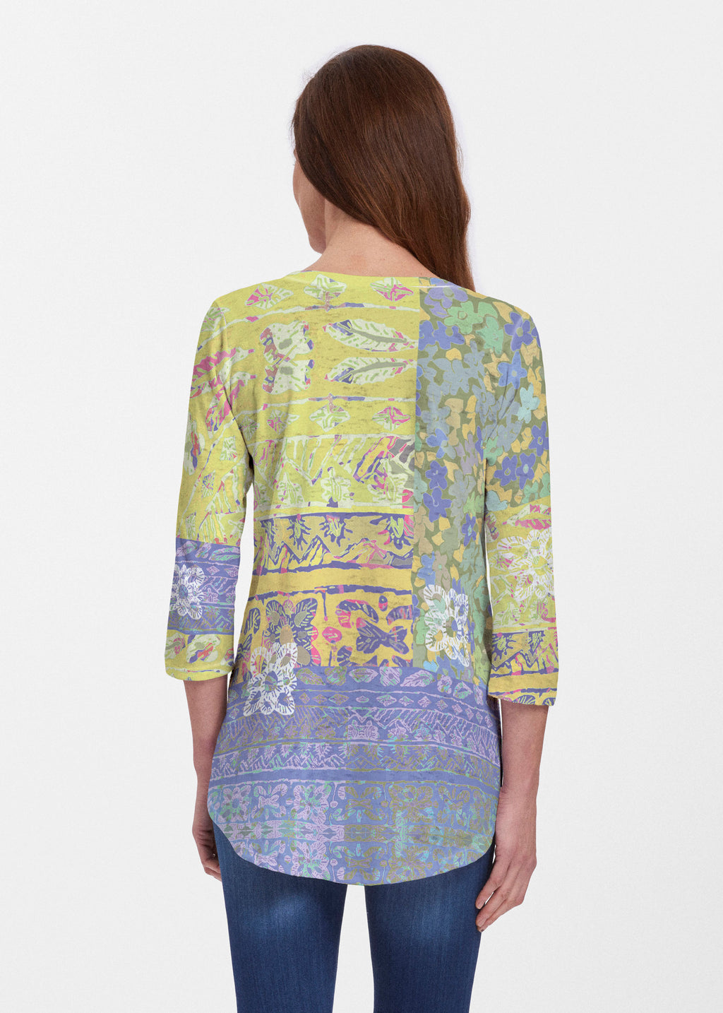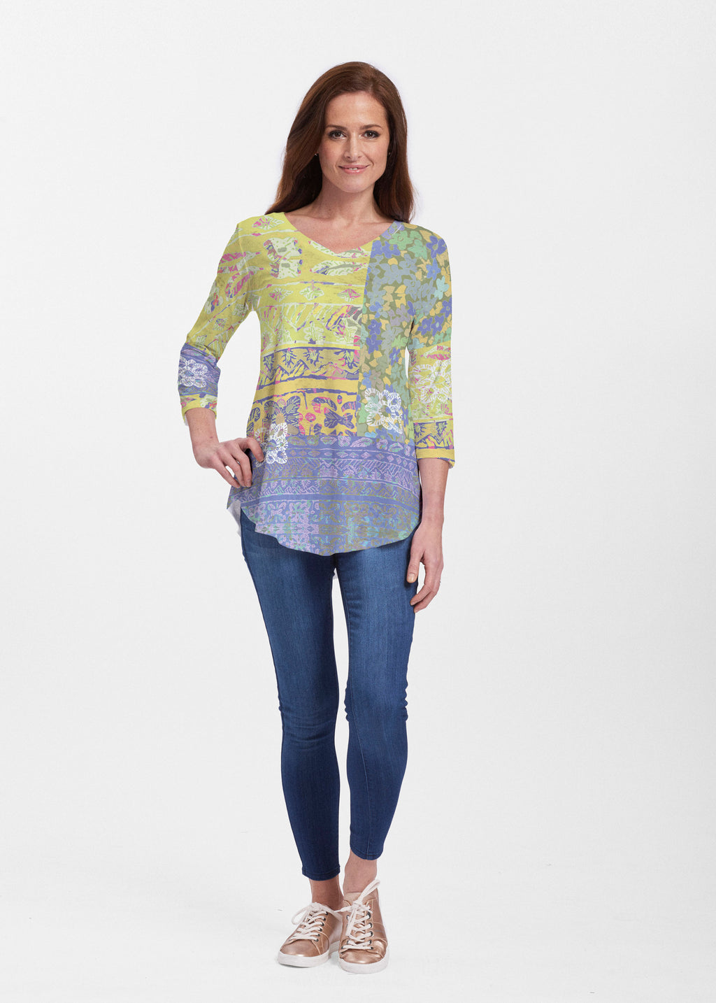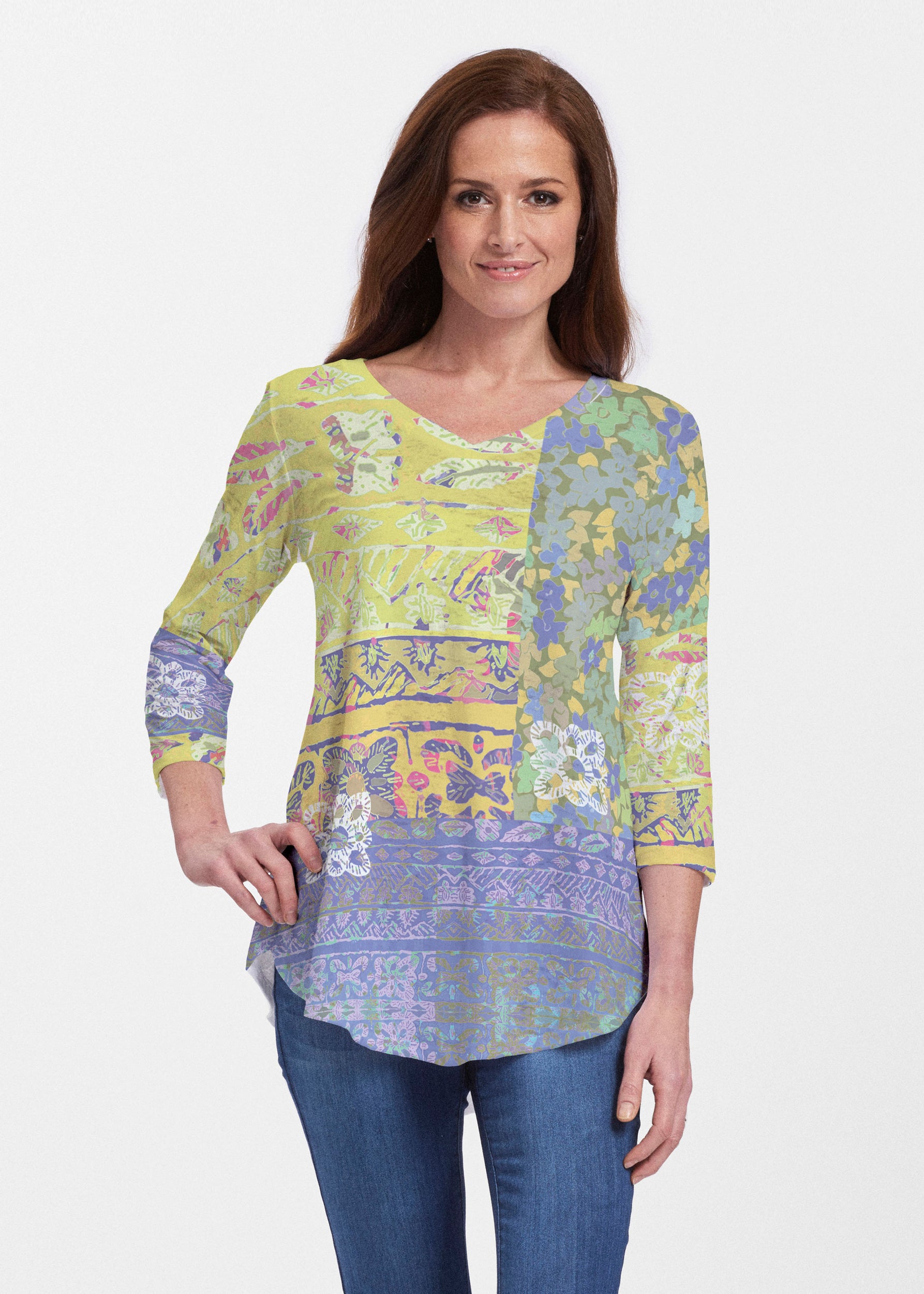 This v-neck tunic in our Signature burnout fabric is forever flattering. 3/4 sleeves and a v-neck flow into a full, swinging shirttail hem.