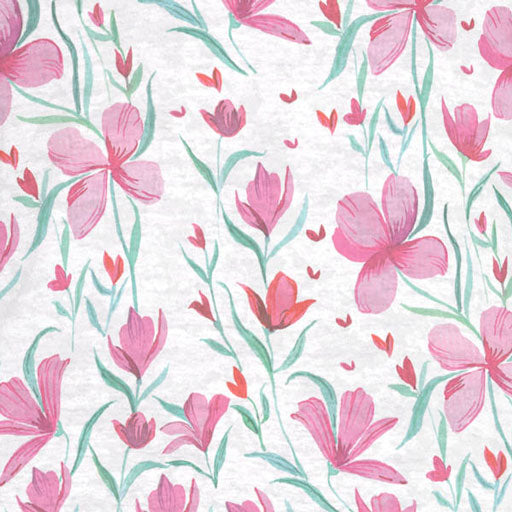 An array of raspberry pink blooming stems with pops of minty green paisley on the back.