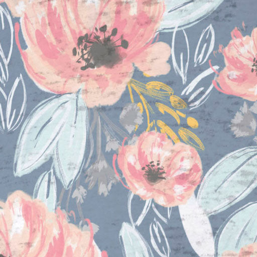 A brilliant sea of teal with floating peachy colored blossoming blooms with a complimentary forearm design of soft cloud gray and white.