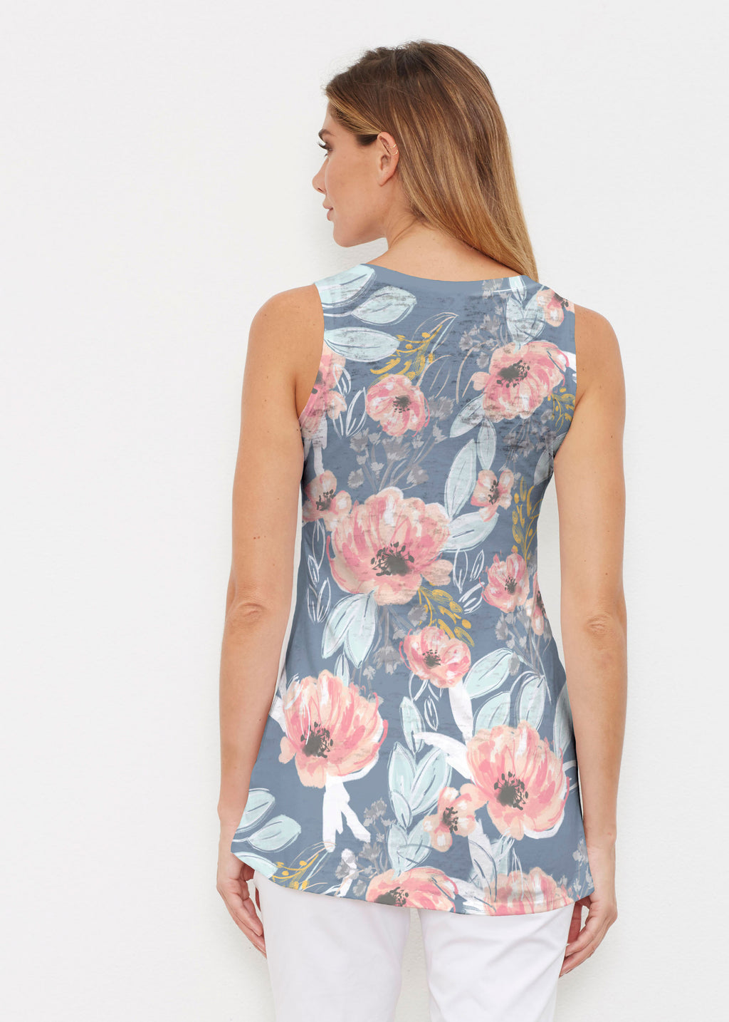 This tank is the perfect combination of an elegant shape with a sporty look. A high-low cascading hemline falls loosely over the hip in our Signature burnout fabric. No sleeves and a shallow scoop neckline give this tank its sporty vibe. -- Your one-of-a-kind garment is created using all-over soft garment sublimation printing. Selected designs are individually printed into your garment. Cotton/Polyester blend.