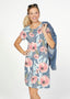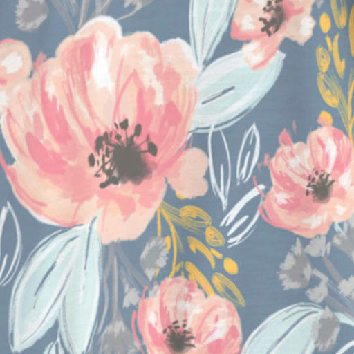 A brilliant sea of teal with floating peachy colored blossoming blooms with a complimentary forearm design of soft cloud gray and white.