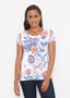 A vibrant hand painted floral and paisley print with stunning shades of blue, orange and white, designed by Susan Werner.