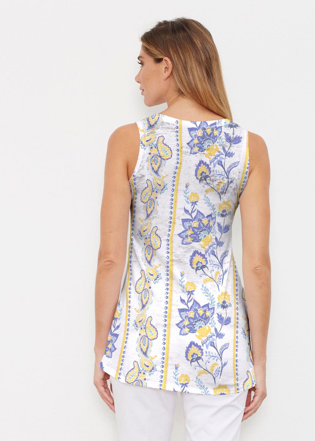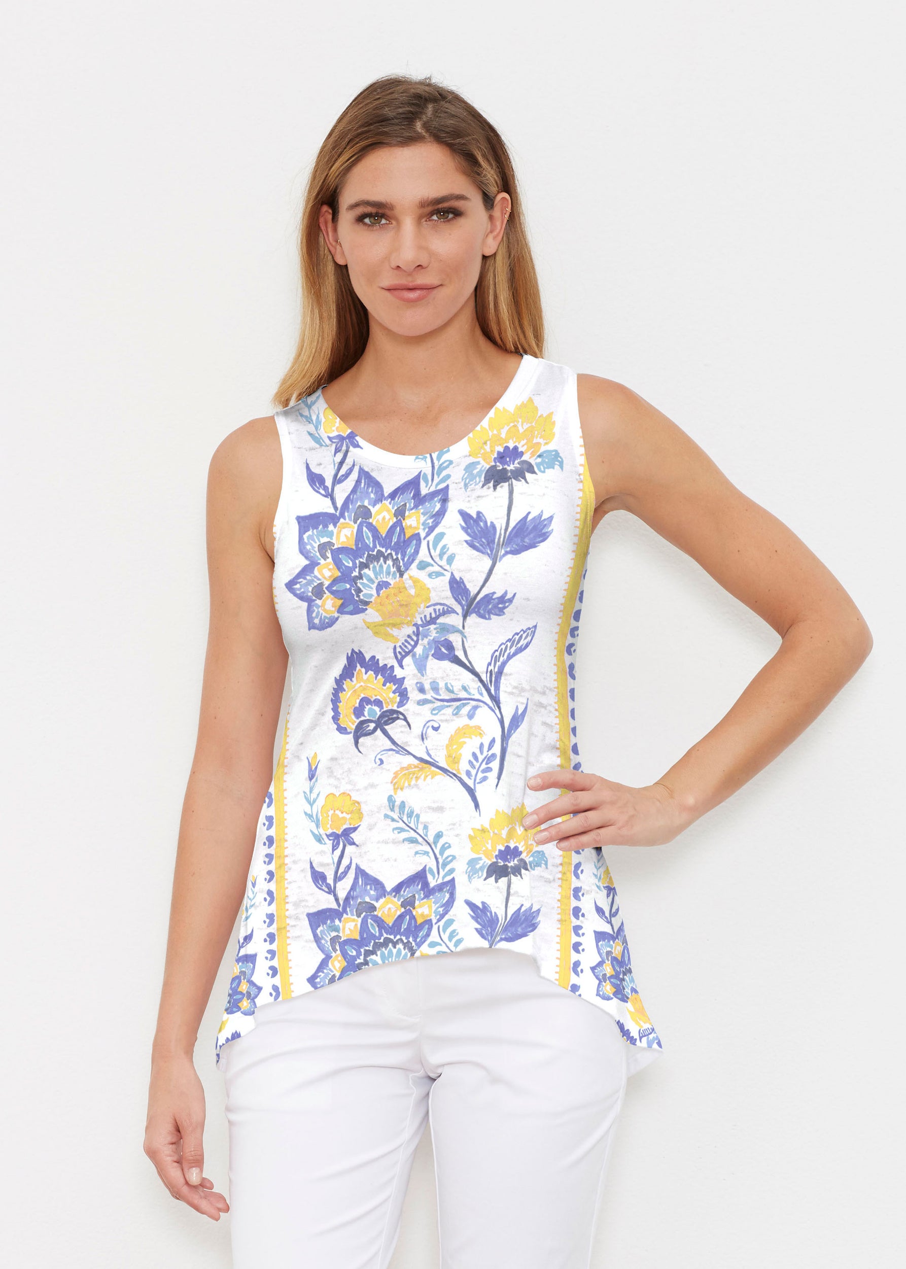 This tank is the perfect combination of an elegant shape with a sporty look. A high-low cascading hemline falls loosely over the hip in our Signature burnout fabric. No sleeves and a shallow scoop neckline give this tank its sporty vibe. -- Your one-of-a-kind garment is created using all-over soft garment sublimation printing. Selected designs are individually printed into your garment. Cotton/Polyester blend.