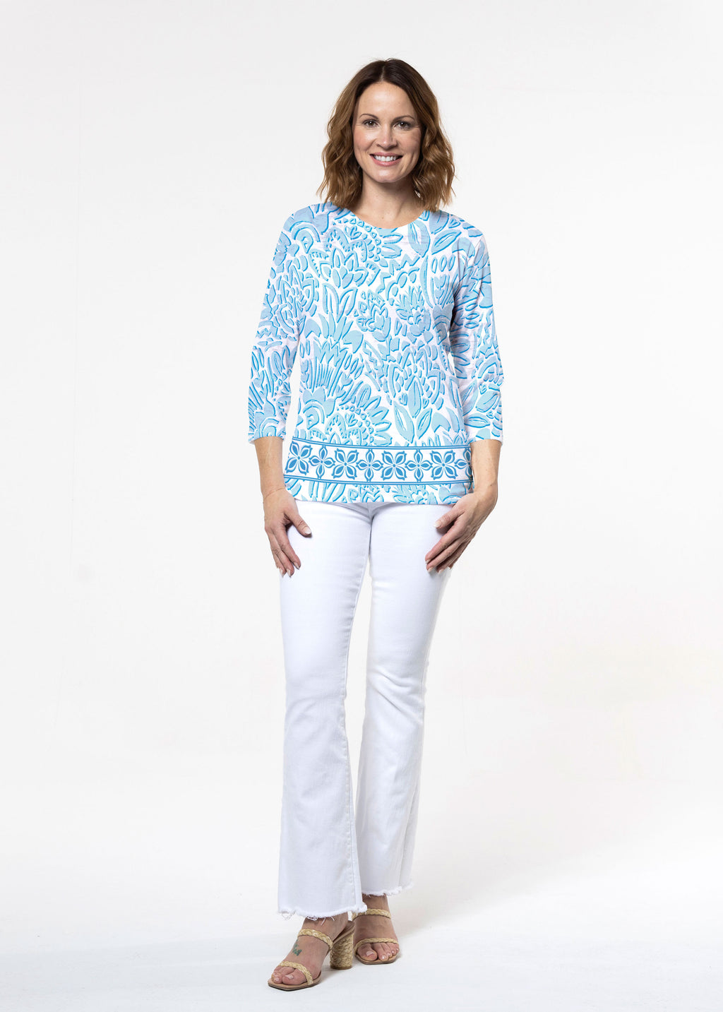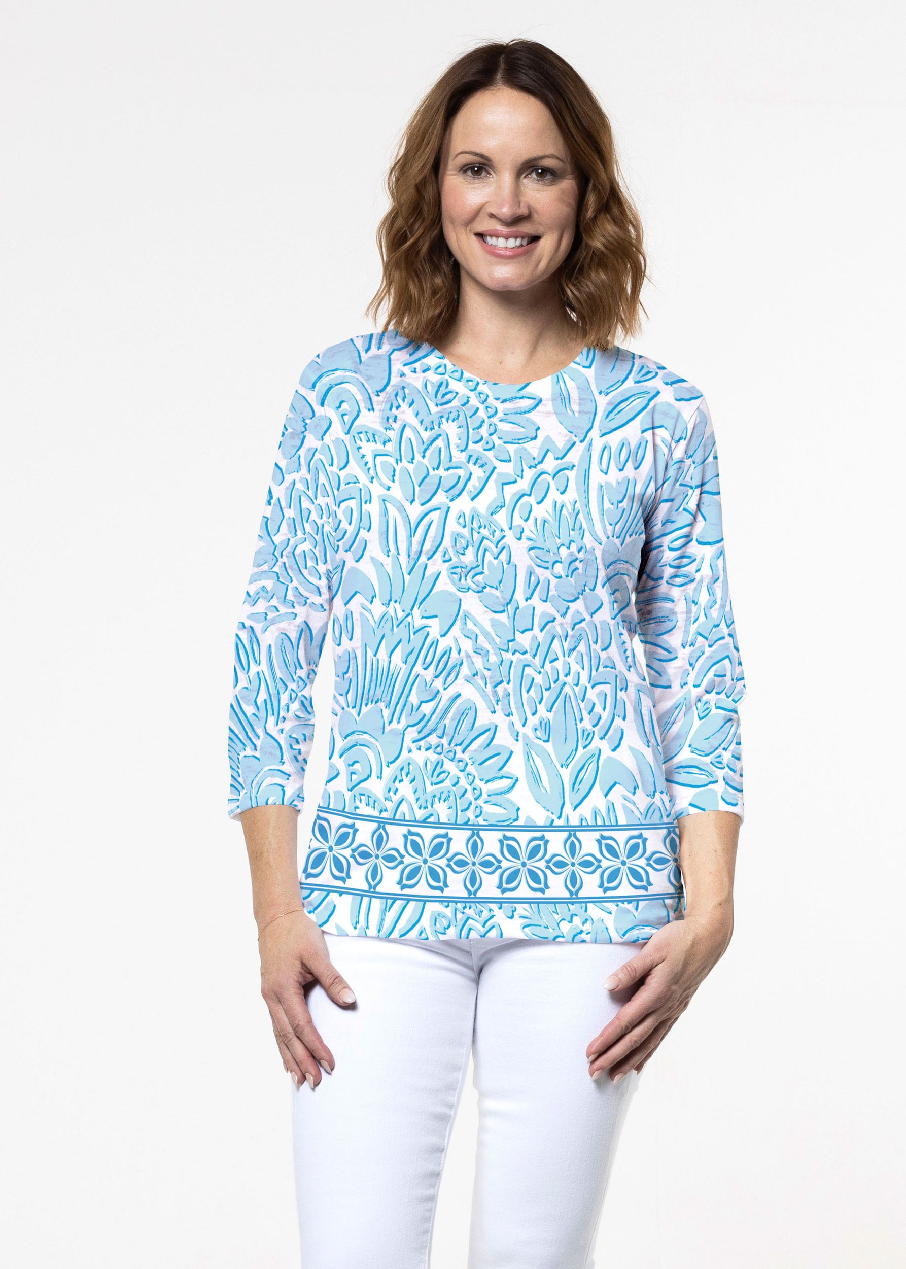 Flattering Signature fabric 3/4 sleeves and a crew neck are perfectly proportioned and more of a relaxed fit.