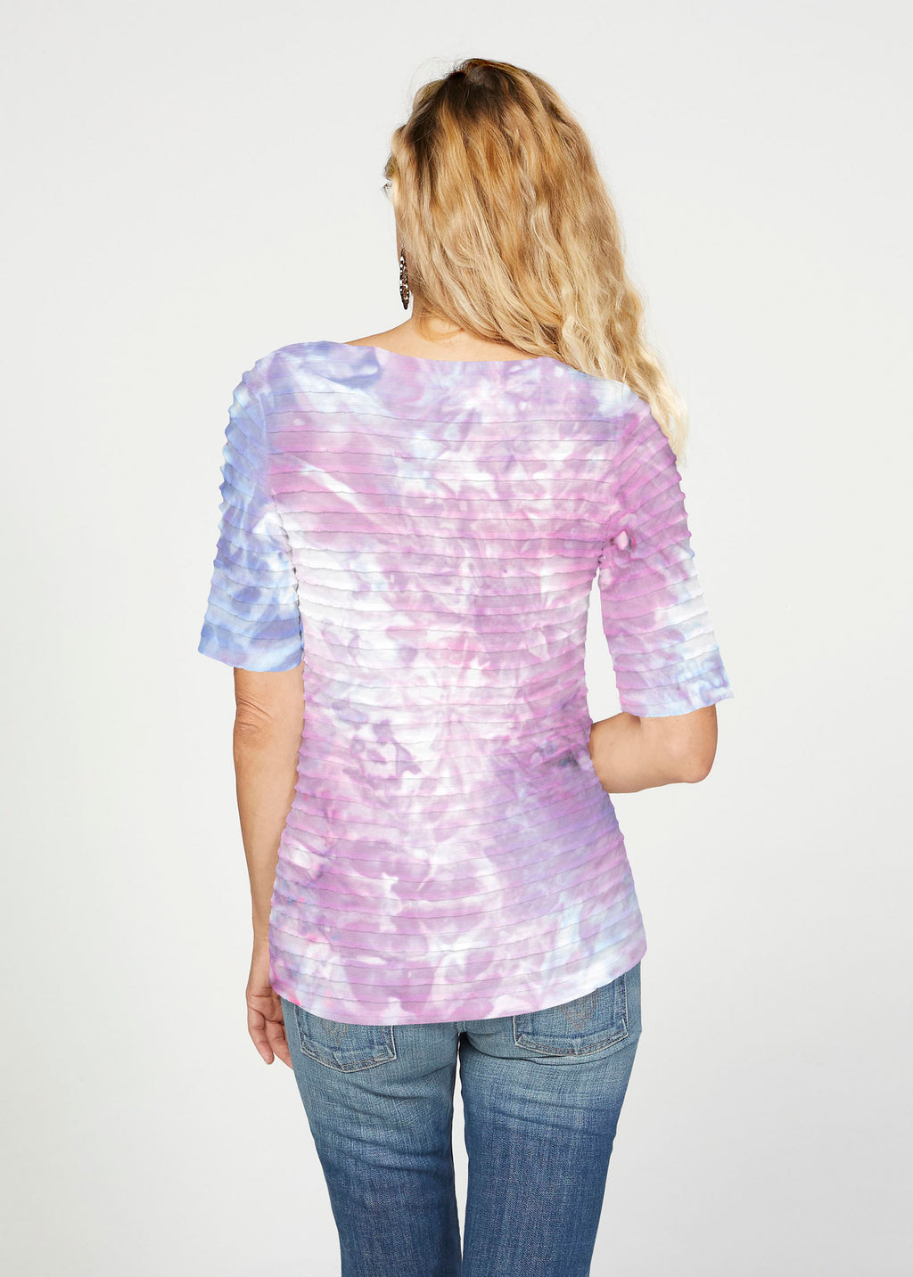 The uniquely soft, pleated texture in this Banded fabric gives the elbow sleeve and boat neck top a fun and sophisticated look. Easy relaxed fit with a hemline that comes below the hip.