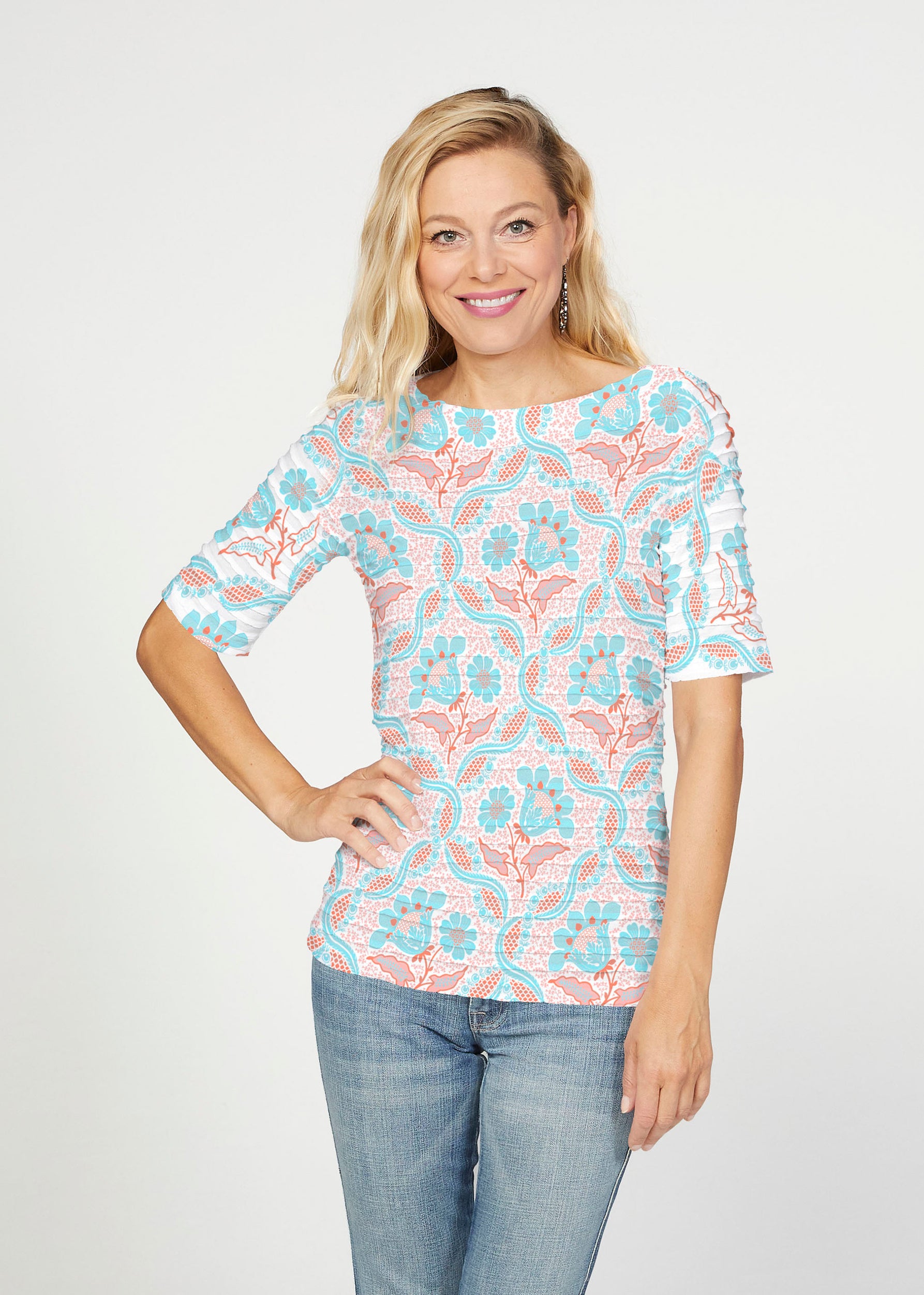 The uniquely soft, pleated texture in this Banded fabric gives the elbow sleeve and boat neck top a fun and sophisticated look. Easy relaxed fit with a hemline that comes below the hip.