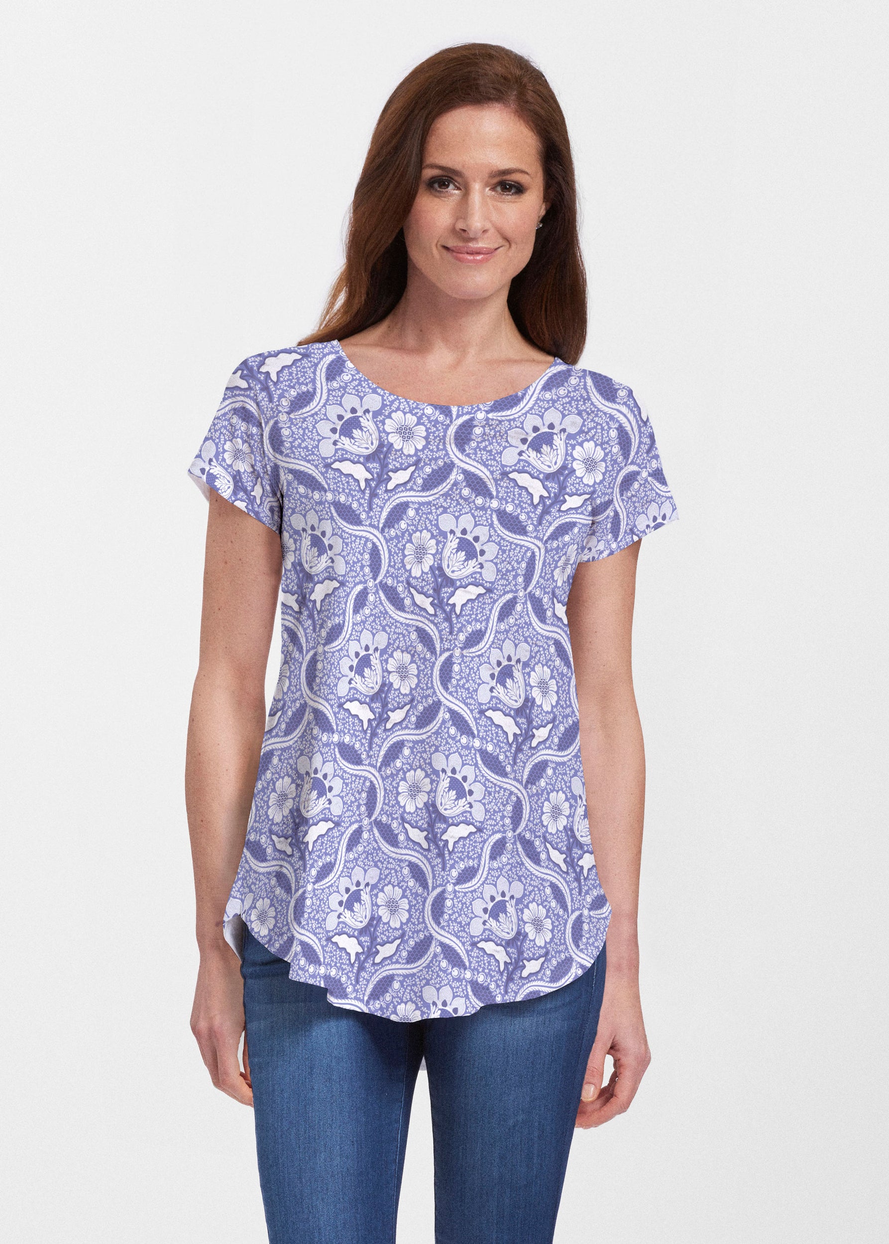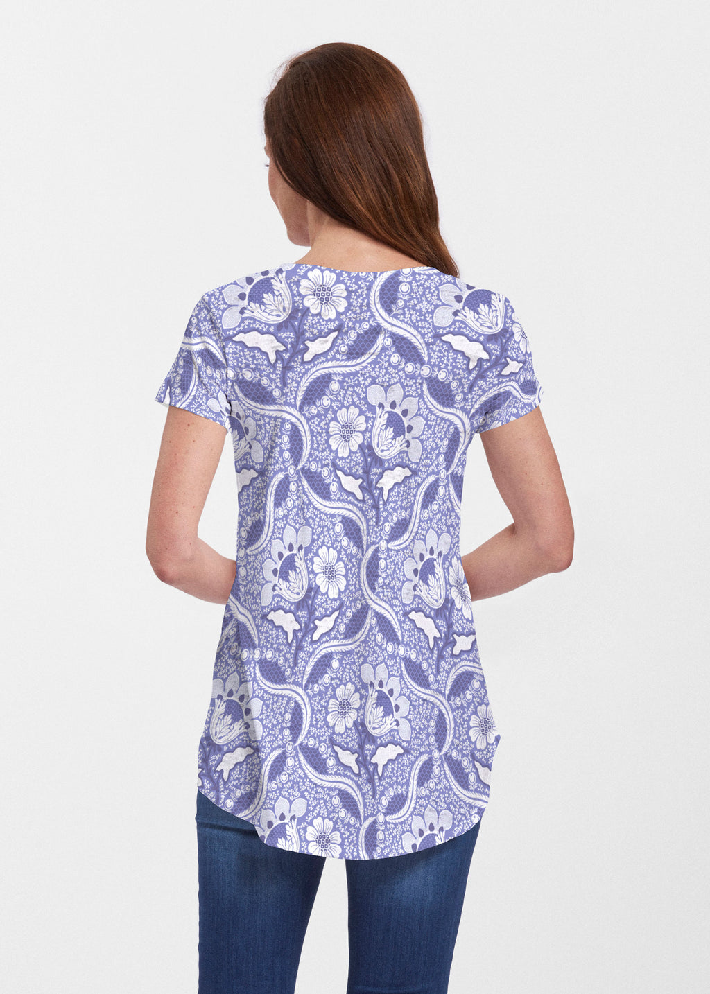 An effortlessly flattering tunic in our soft Signature burnout fabric featuring short sleeves and a scoop neck with a body that flows into a full, swinging shirttail hem.