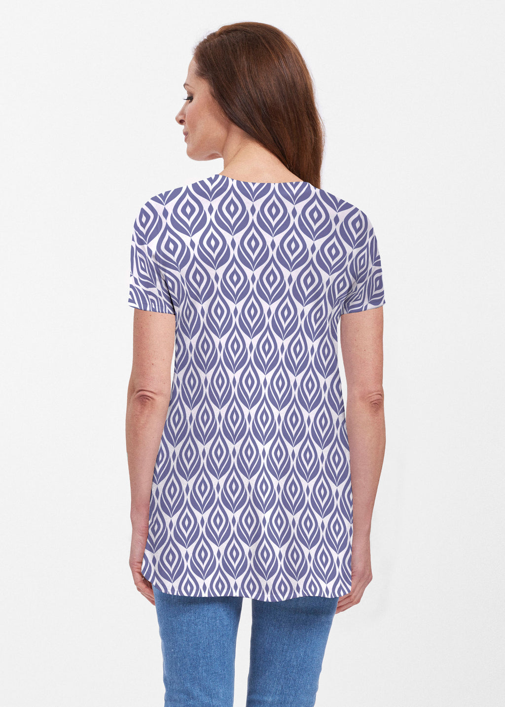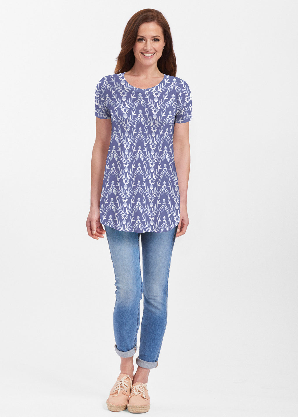 Our soft and feminine short sleeve silhouette tunic is sure to flatter any figure. Made in our Butterknit fabic that flows into a relaxed curved hem that is slightly longer in the back with subtle side slits.