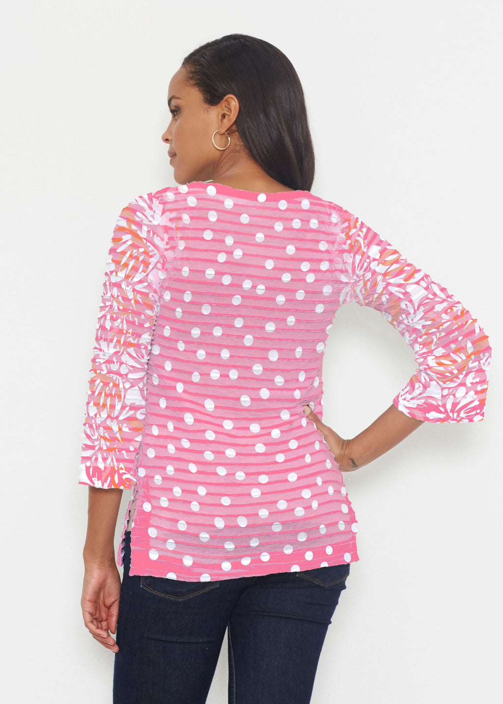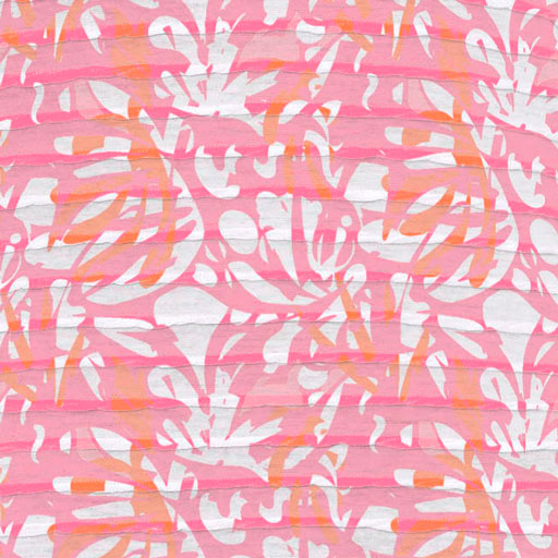 A playful mixture of pinks and oranges makes for a festive twist on traditional camo. Polka dotted back turns this Susan Werner design into summer fun.