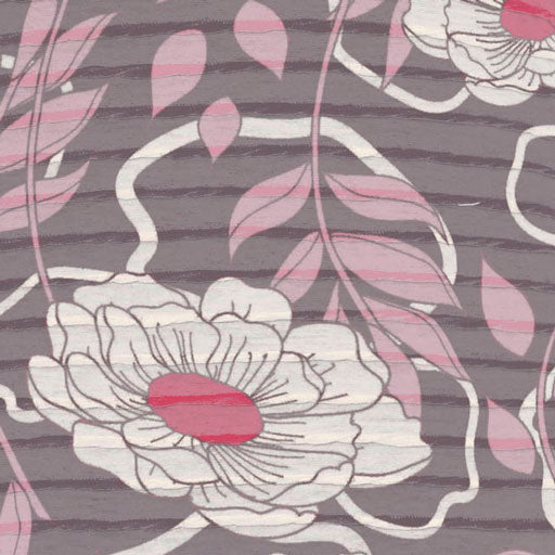An artistic flare of creamy blooms with ruby red centers on a black backdrop with contrasting pewter gray sleeves.
