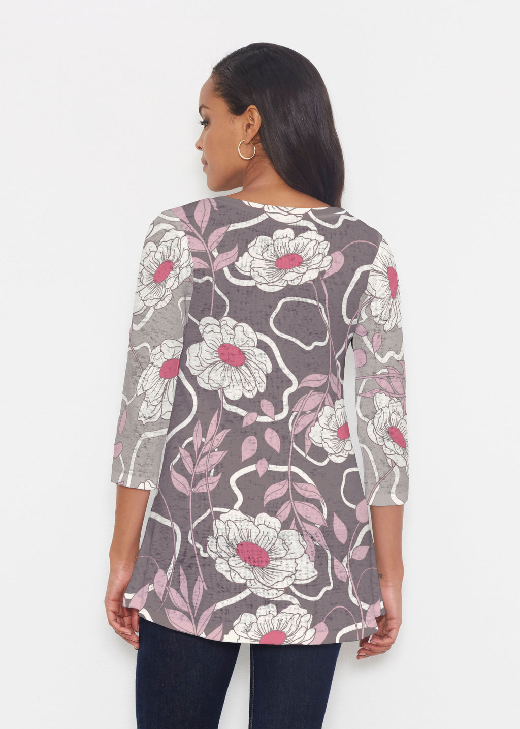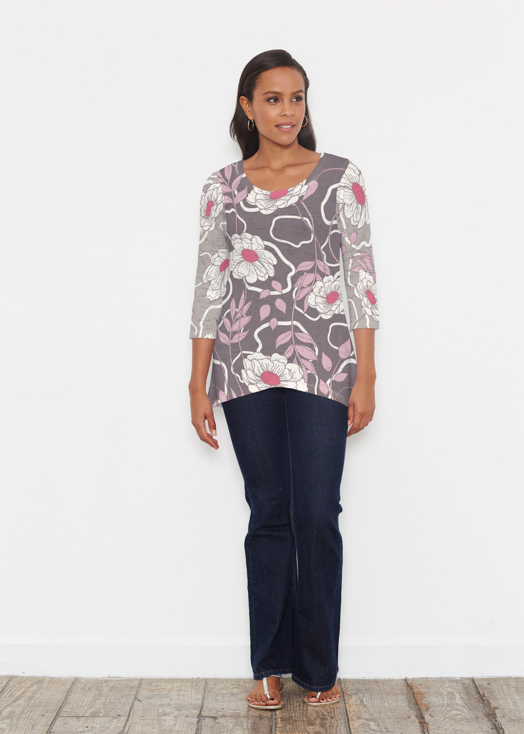 An elegant fit, the hemline falls higher in front then cascades beautifully down across back. Delicate scoop neckline and 3/4 sleeves made in our soft Baby Waffle burnout thermal blend.