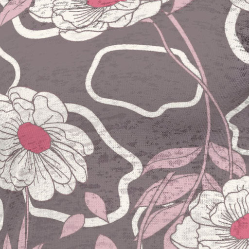 An artistic flare of creamy blooms with ruby red centers on a black backdrop with contrasting pewter gray sleeves.