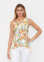 A stunning hand painted brushed floral print in yellow, orange, red, teal and blue designed by Susan Werner.