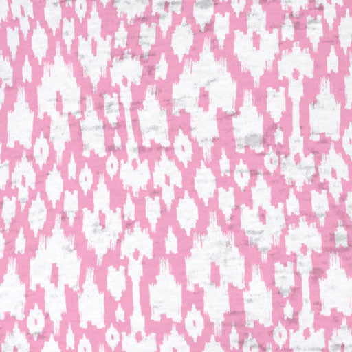Devilishly pink ikat print mixed with a retro cubed floral geometric, in white and pink. designed by Susan Werner.