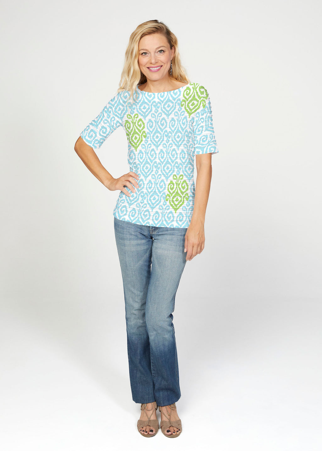 The uniquely soft, pleated texture in this Banded fabric gives the elbow sleeve and boat neck top a fun and sophisticated look. Easy relaxed fit with a hemline that comes below the hip.