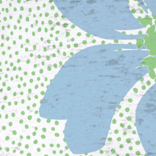 A large steel blue and bright green summer bloom afloat a white sea of bright green polka dots with a coordinating pattern on back.