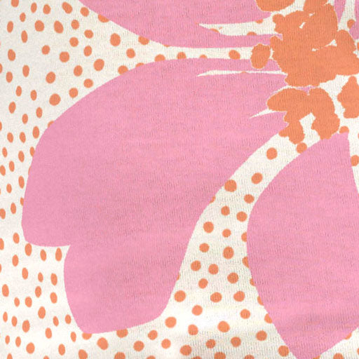 A large hot pink and orange summer bloom afloat a white sea of orange polka dots with a coordinating pattern on back.