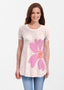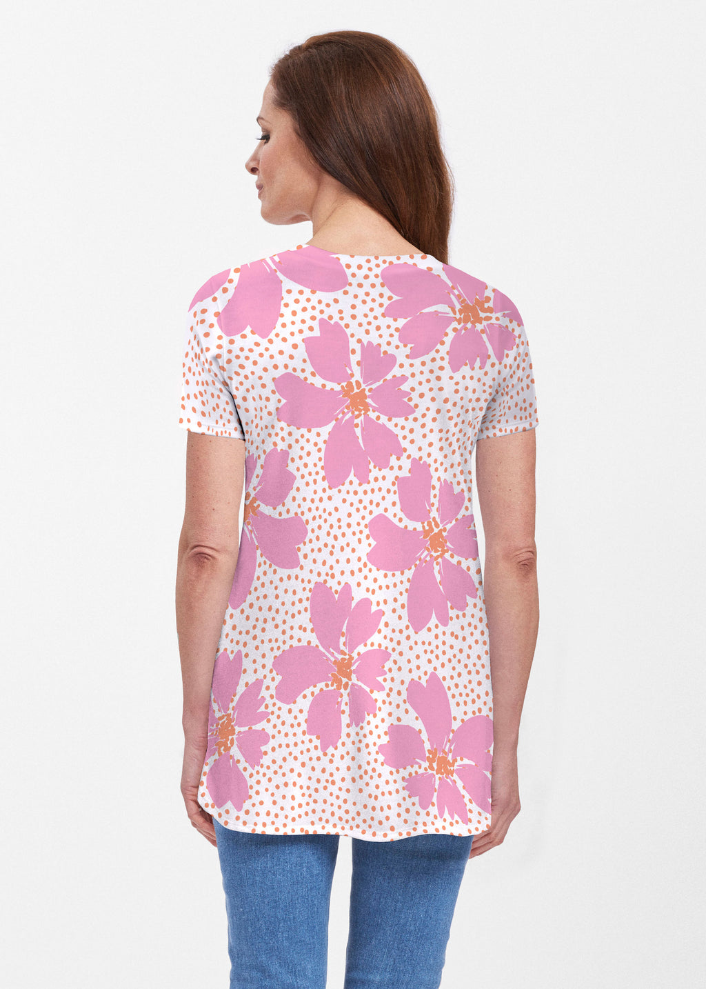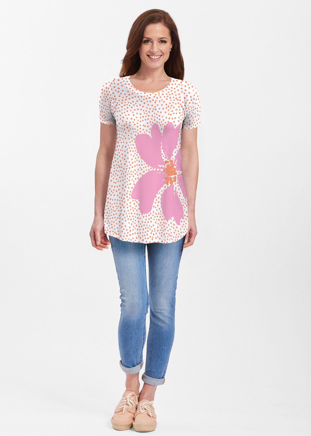 Our soft and feminine short sleeve silhouette tunic is sure to flatter any figure. Made in our Butterknit fabic that flows into a relaxed curved hem that is slightly longer in the back with subtle side slits.