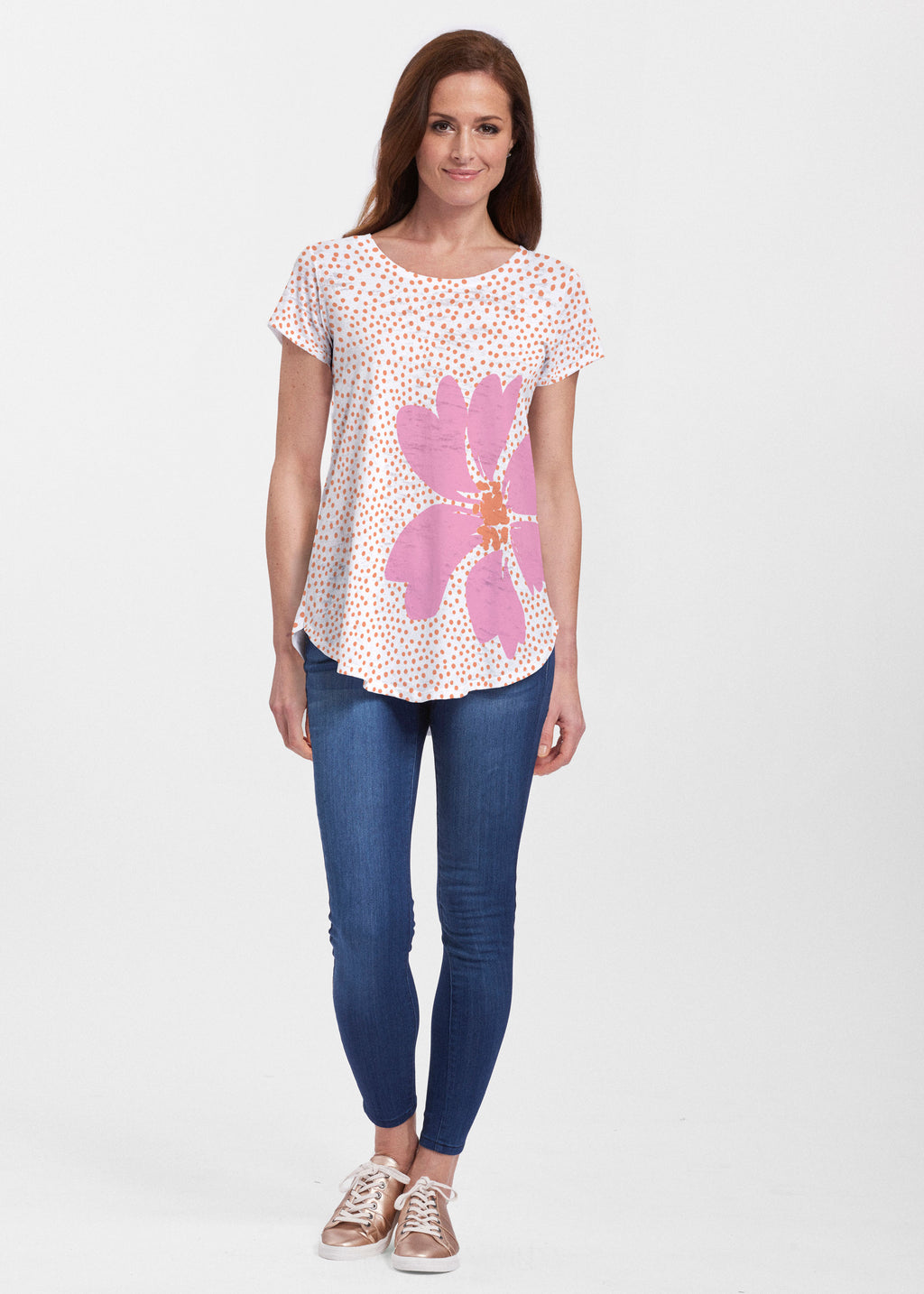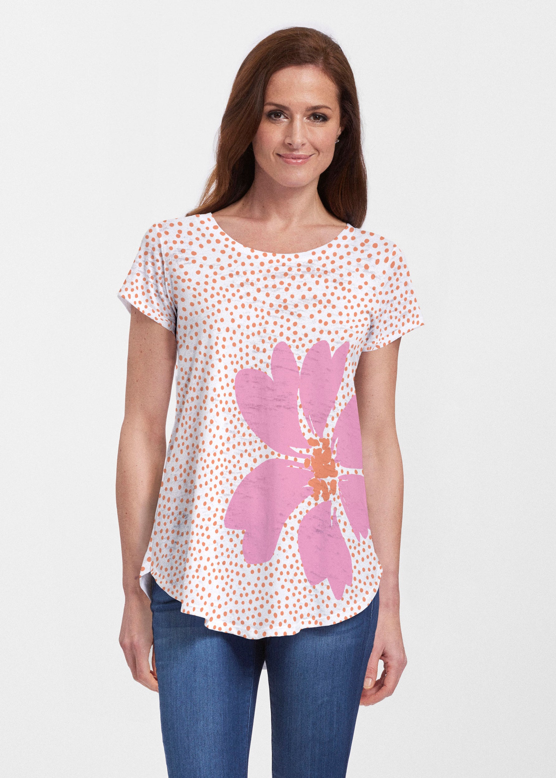 An effortlessly flattering tunic in our soft Signature burnout fabric featuring short sleeves and a scoop neck with a body that flows into a full, swinging shirttail hem.