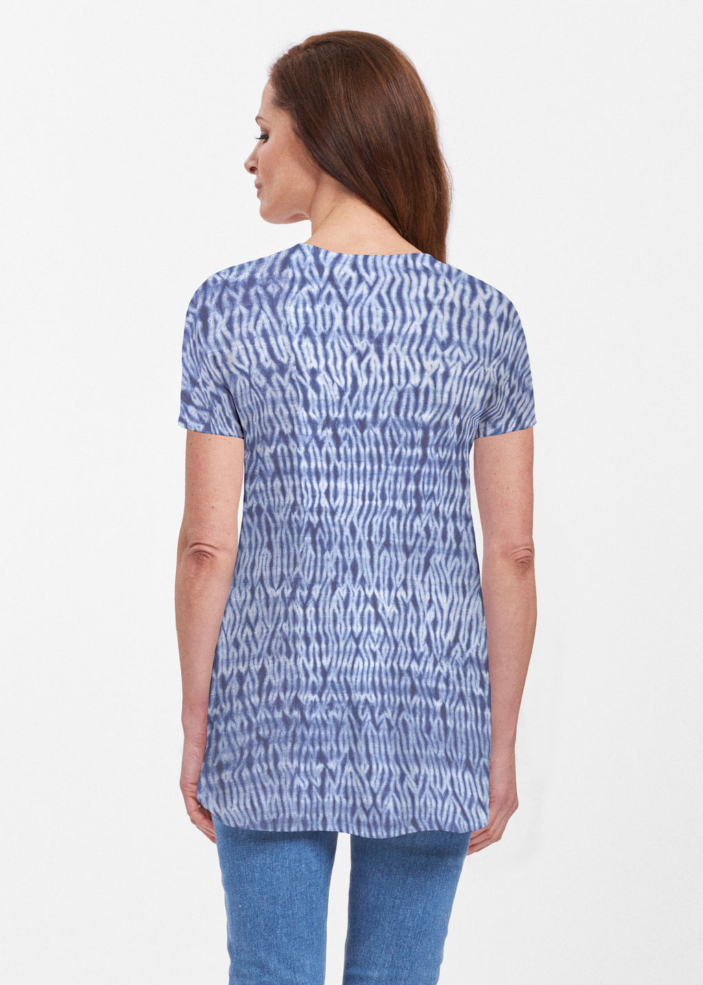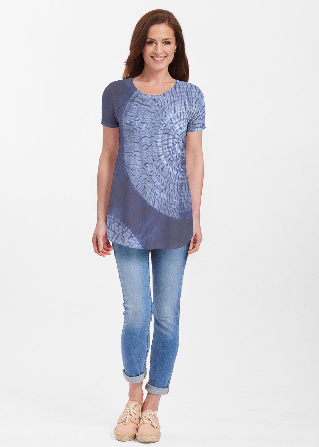 Our soft and feminine short sleeve silhouette tunic is sure to flatter any figure. Made in our Butterknit fabic that flows into a relaxed curved hem that is slightly longer in the back with subtle side slits.