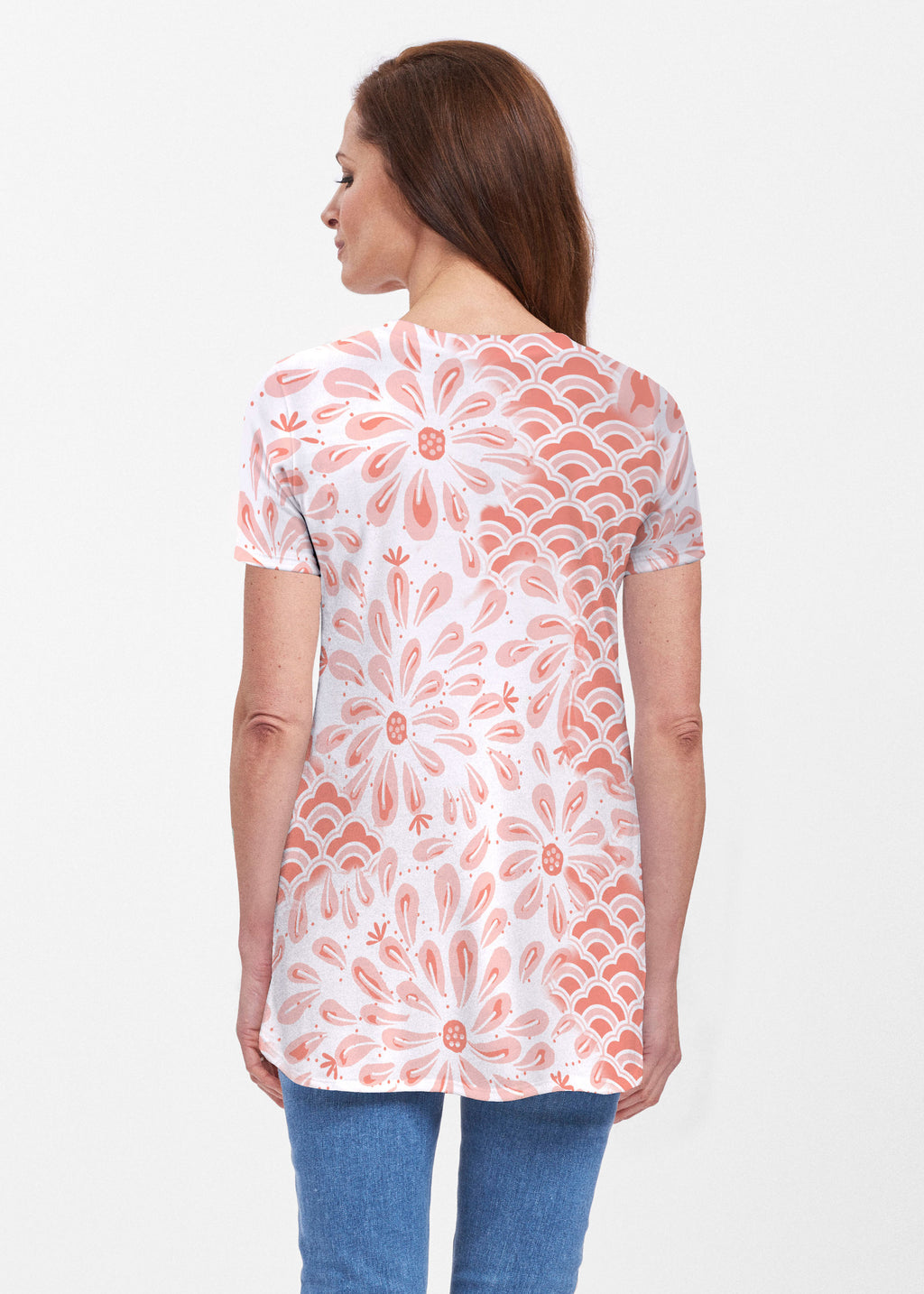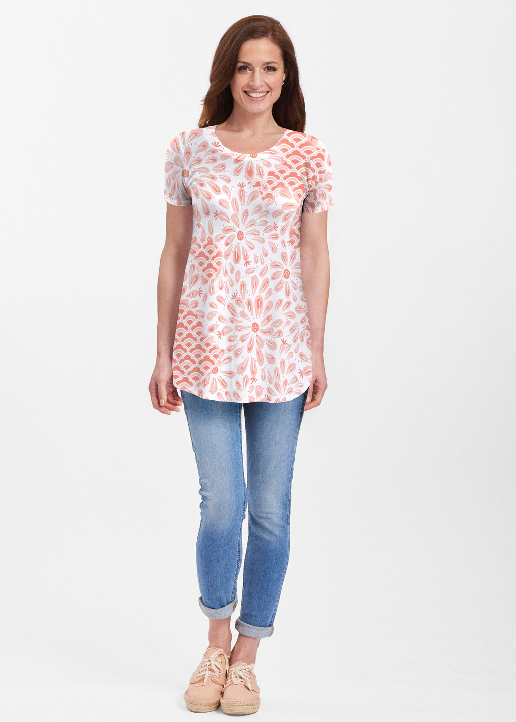 Our soft and feminine short sleeve silhouette tunic is sure to flatter any figure. Made in our Butterknit fabic that flows into a relaxed curved hem that is slightly longer in the back with subtle side slits.