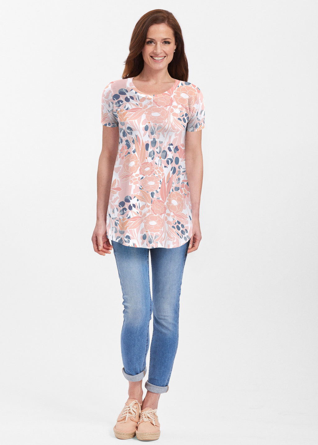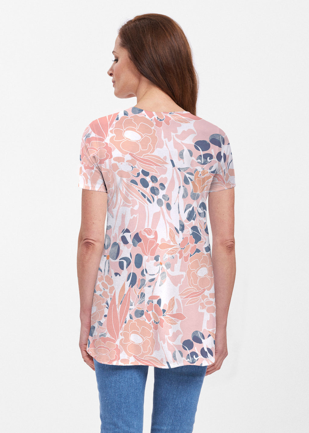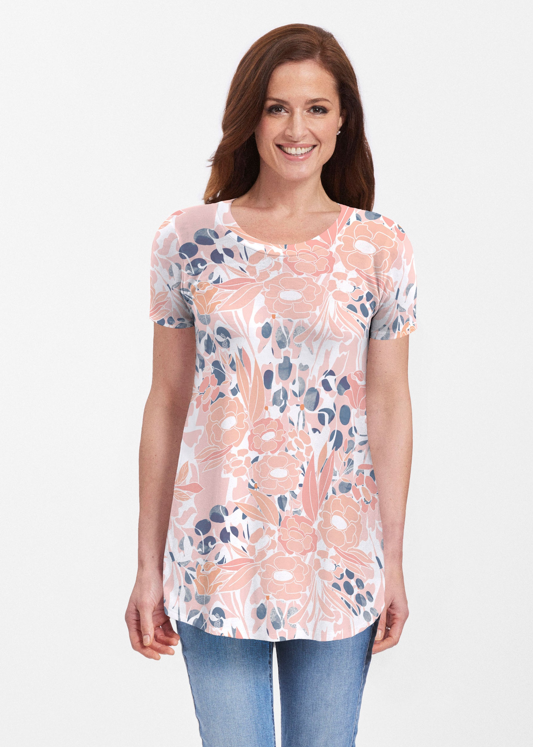 Our soft and feminine short sleeve silhouette tunic is sure to flatter any figure. Made in our Butterknit fabic that flows into a relaxed curved hem that is slightly longer in the back with subtle side slits.