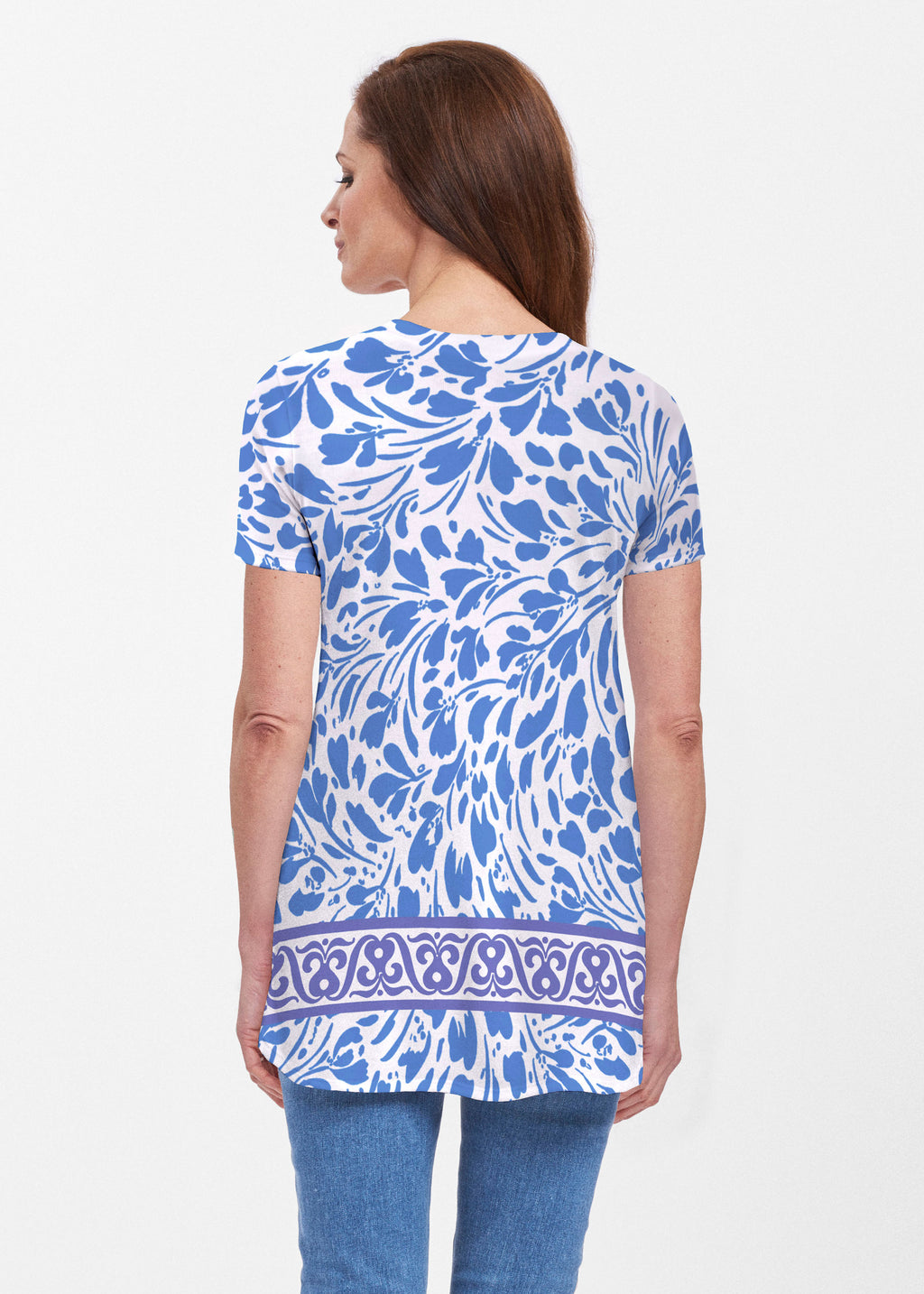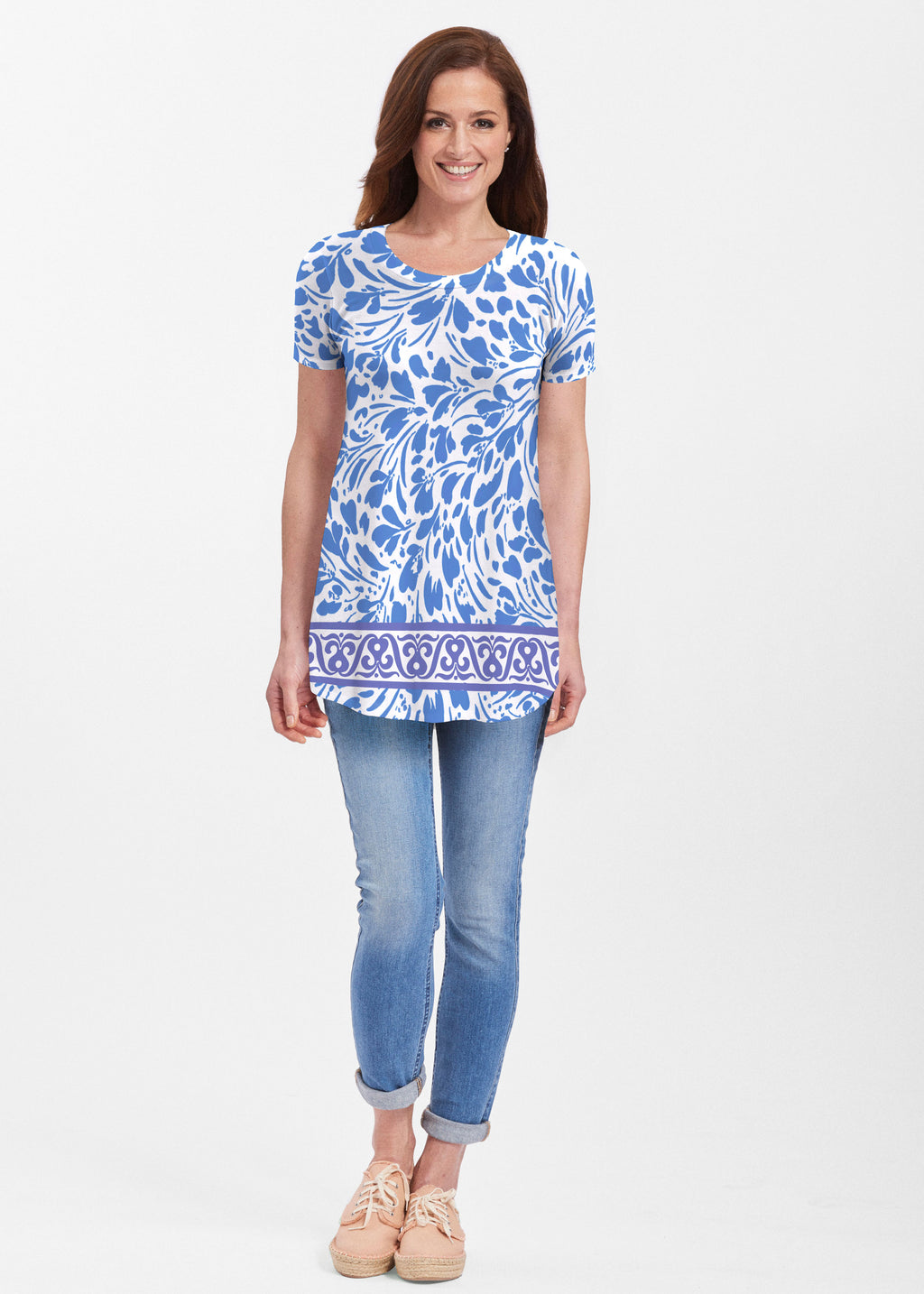 Our soft and feminine short sleeve silhouette tunic is sure to flatter any figure. Made in our Butterknit fabic that flows into a relaxed curved hem that is slightly longer in the back with subtle side slits.