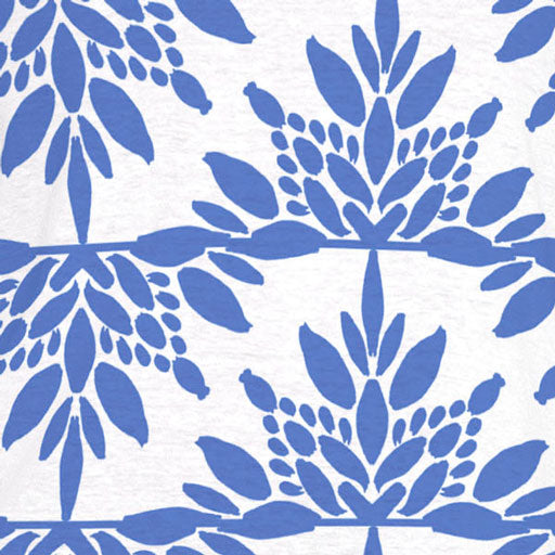Eye catching royal blue geometric spindles on a white canvas with a pop of color in pink and yellow on the forearm.