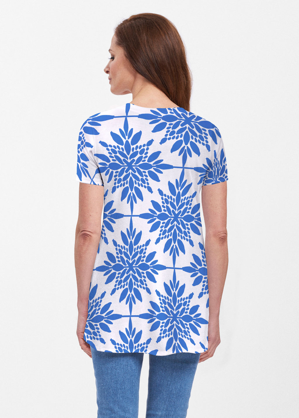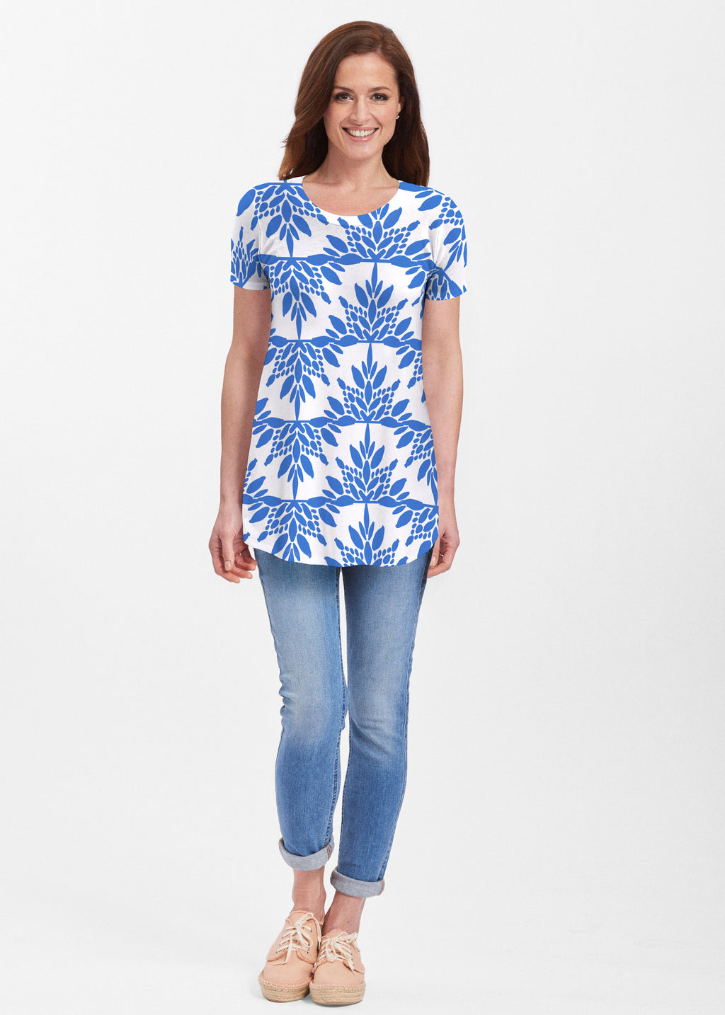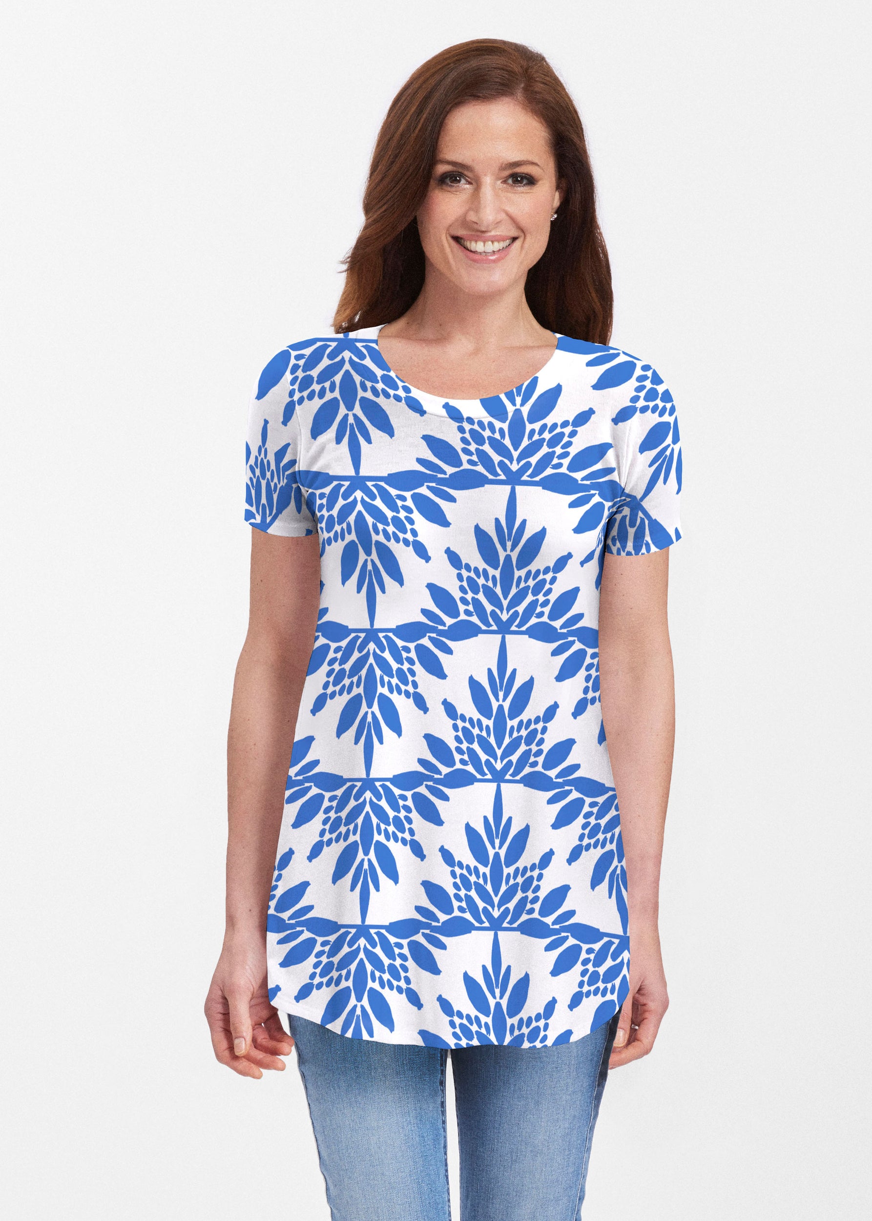 Our soft and feminine short sleeve silhouette tunic is sure to flatter any figure. Made in our Butterknit fabic that flows into a relaxed curved hem that is slightly longer in the back with subtle side slits.