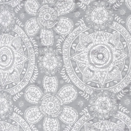 Intricately detailed print with etched medallions in shades of grey complimented by offsetting boho floral sleeves. Designed by Susan Werner.