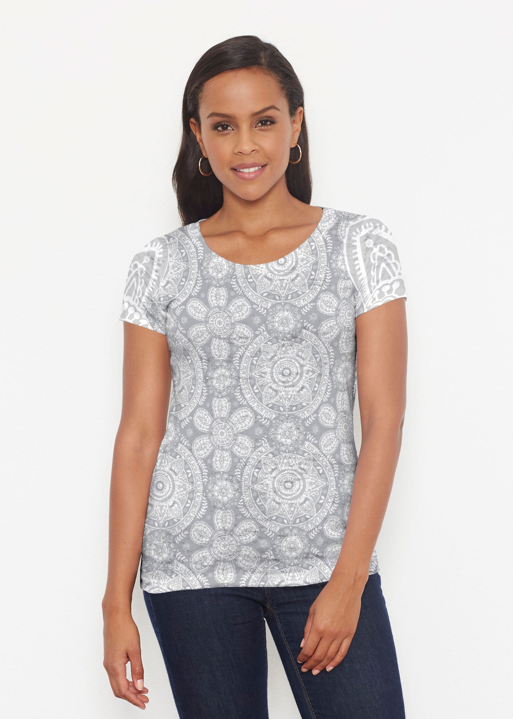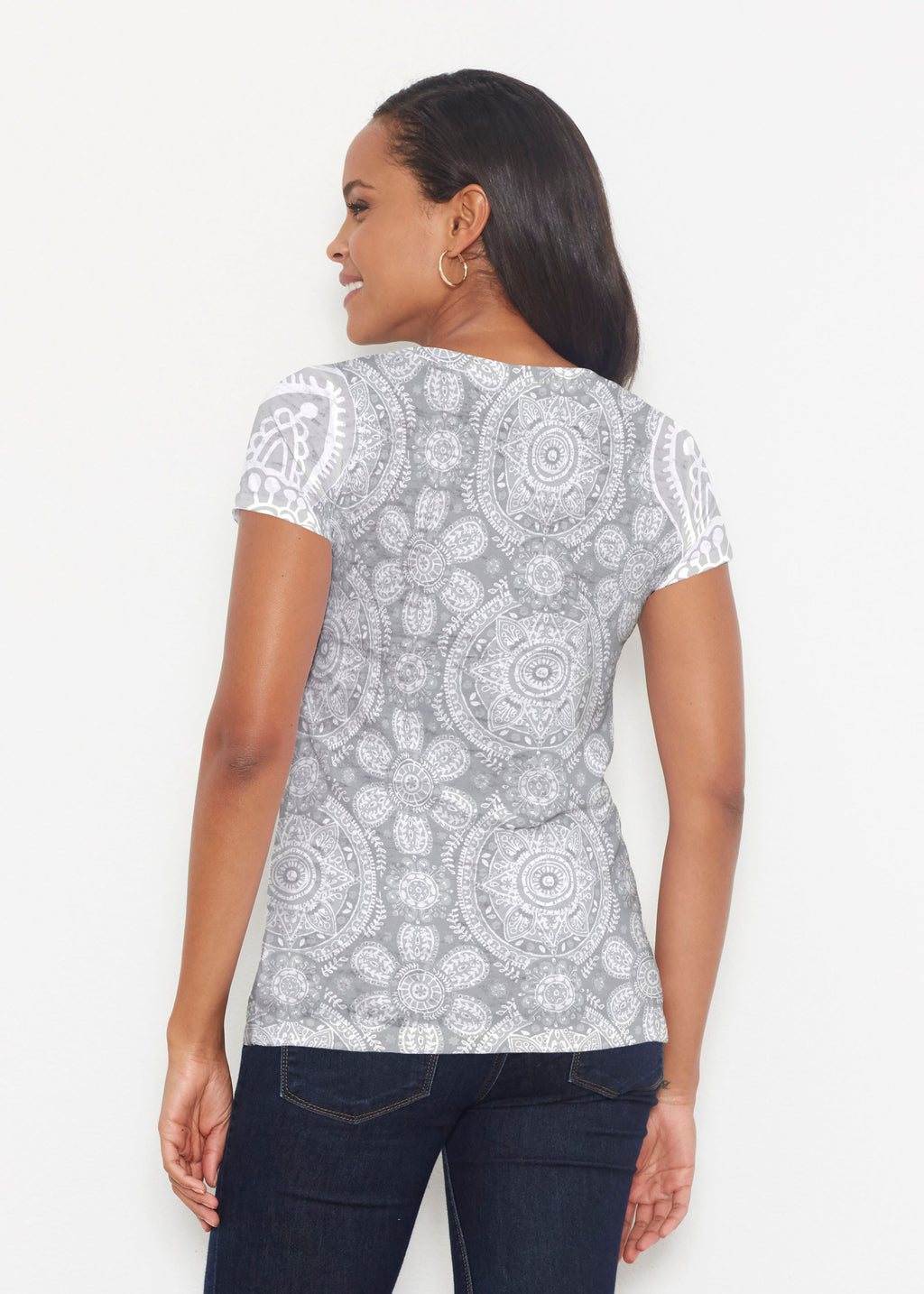 Intricately detailed print with etched medallions in shades of grey complimented by offsetting boho floral sleeves. Designed by Susan Werner.
