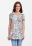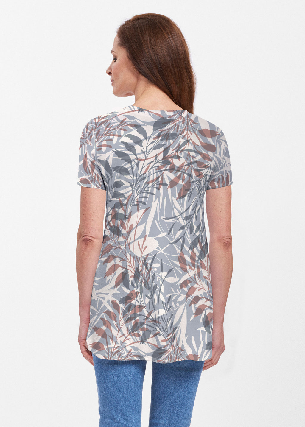 Our soft and feminine short sleeve silhouette tunic is sure to flatter any figure. Made in our Butterknit fabic that flows into a relaxed curved hem that is slightly longer in the back with subtle side slits.