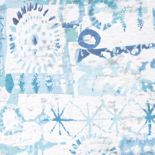 A whimsical geometric print in different hues of blue and white designed by Sara Berrenson.
