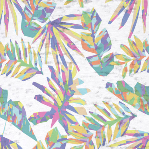 Bold tropical floral print with vivid shades of purple, green, yellow and white.
